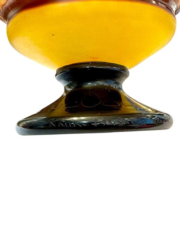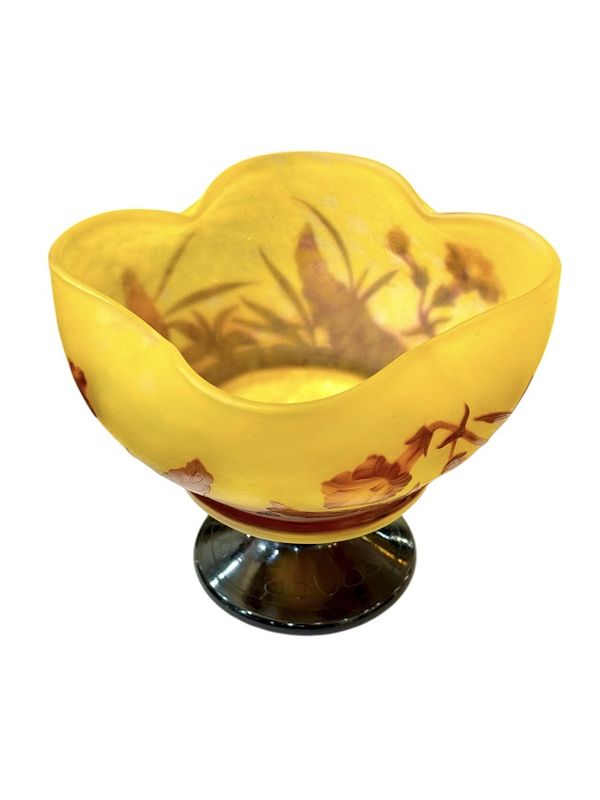 Rare coupe à double épaulement sur piédouche présentant un col quadrilobé pincé à chaud, en verre double. Décor gravé en camée à l'acide et repris à la roue de fleurs de tabac pourpres, sur un fond marmoréen orange et blanc. Parfait rendu lumineux!