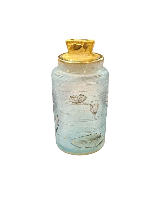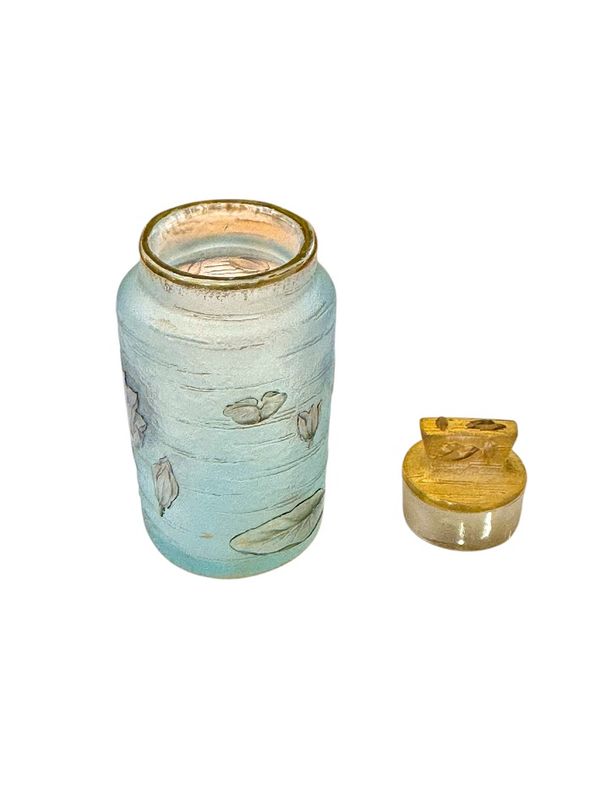 Petit flacon de forme cylindrique en verre irisé, à décor finement gravé et émaillé de fleurs et feuilles de nénuphars sur un fond givré. Le bouchon est également émaillé et réhaussé à l'or avec le même décor aquatique.