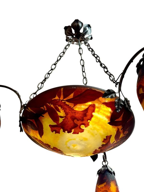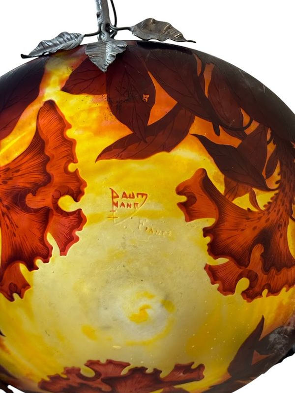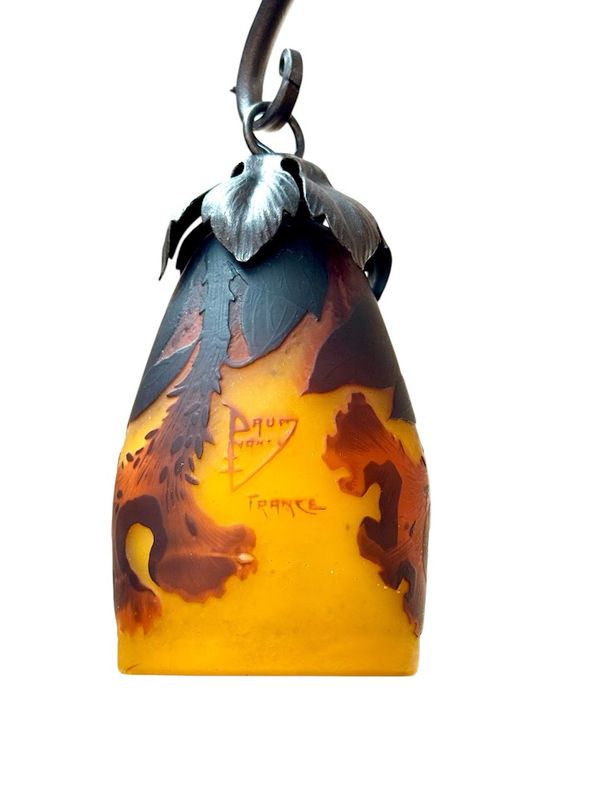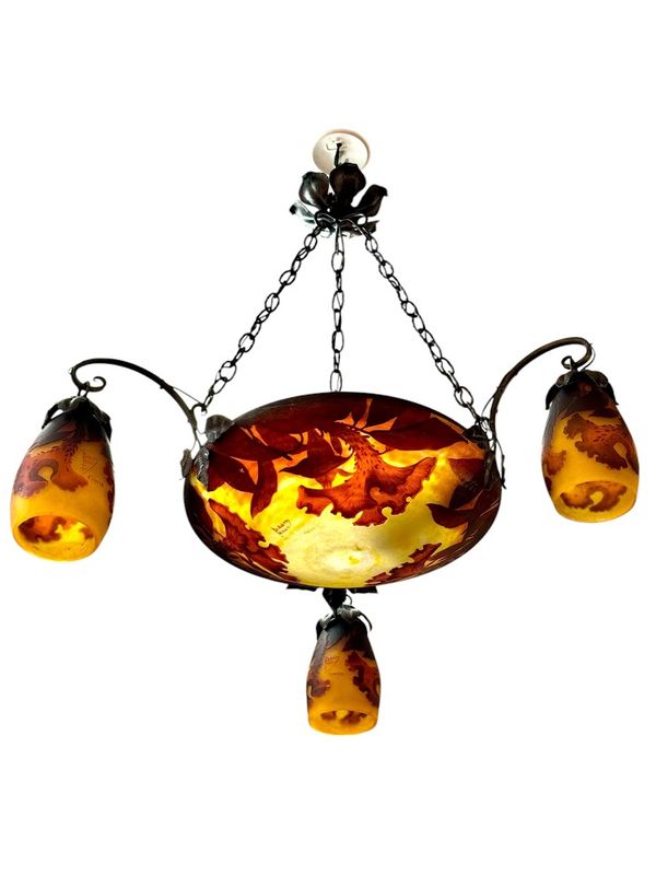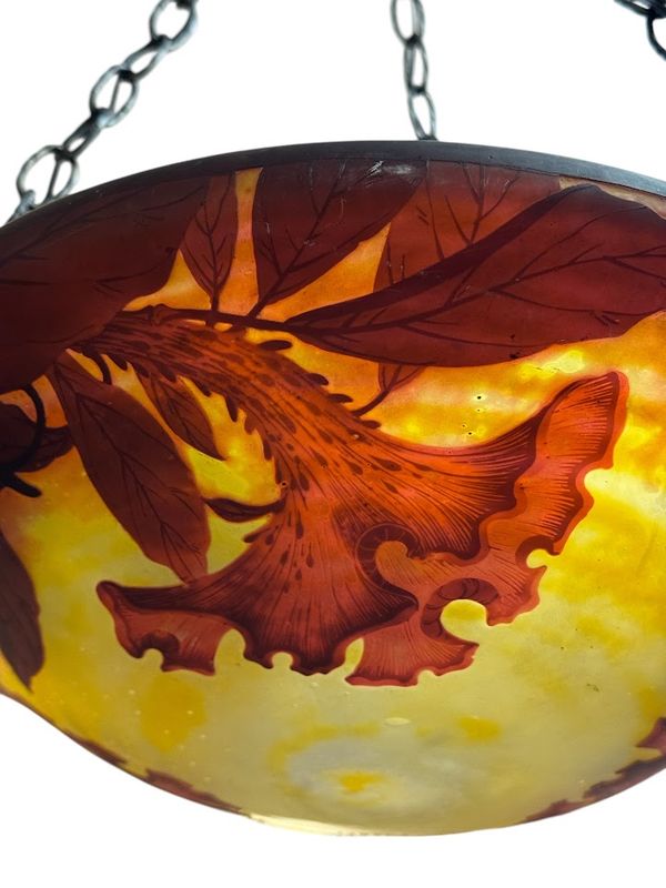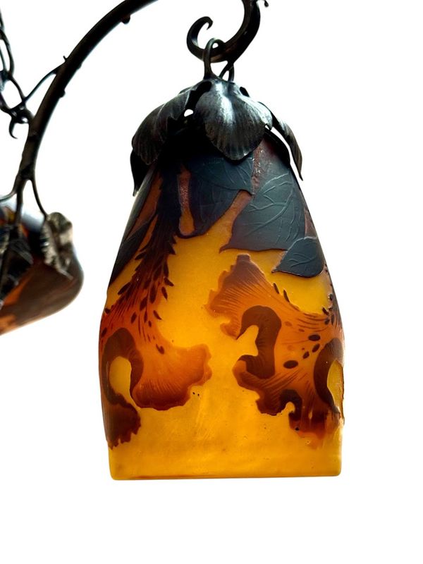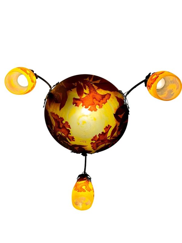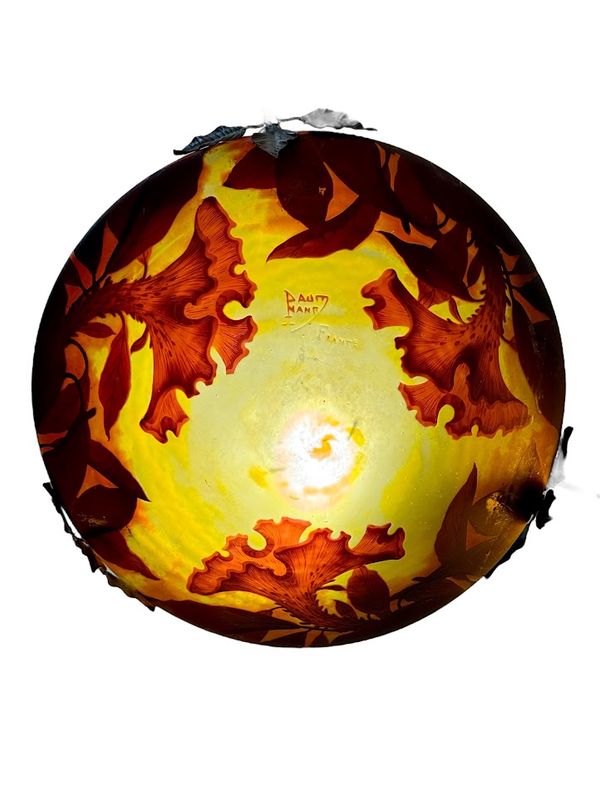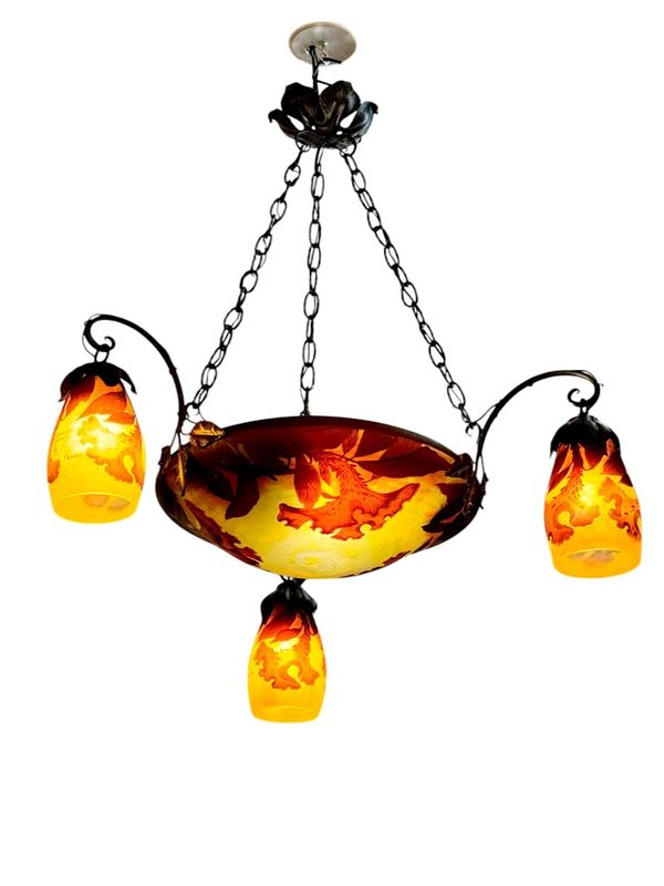 La verrerie présente un décor de crêtes de coq rouges gravées en fines réserves à l'acide, sur un fond marmoréen orange et jaune.