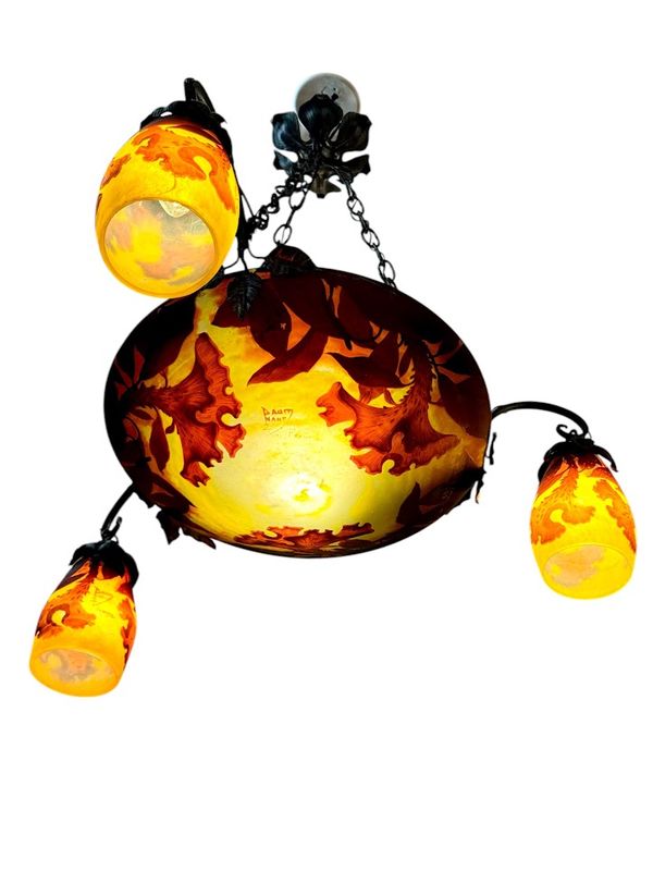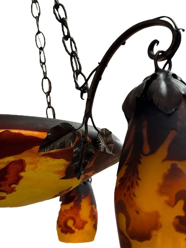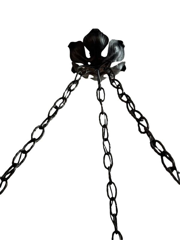 Rare lustre trois tulipes vasque à monture en fer forgé patiné.