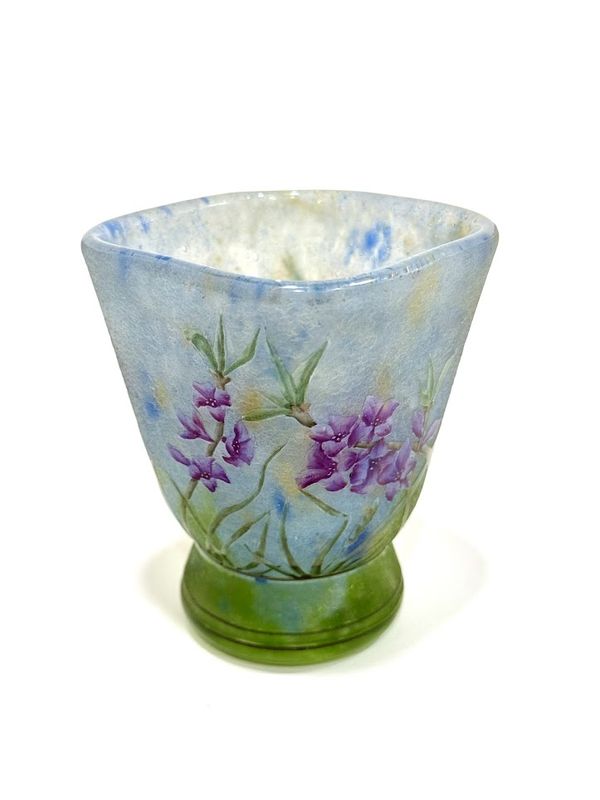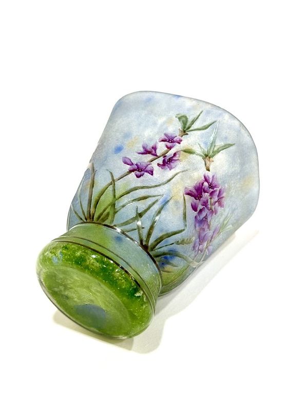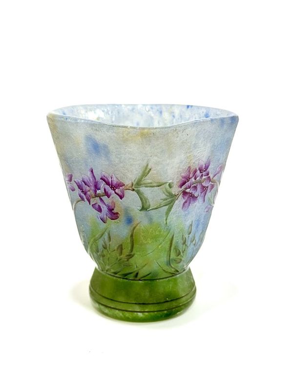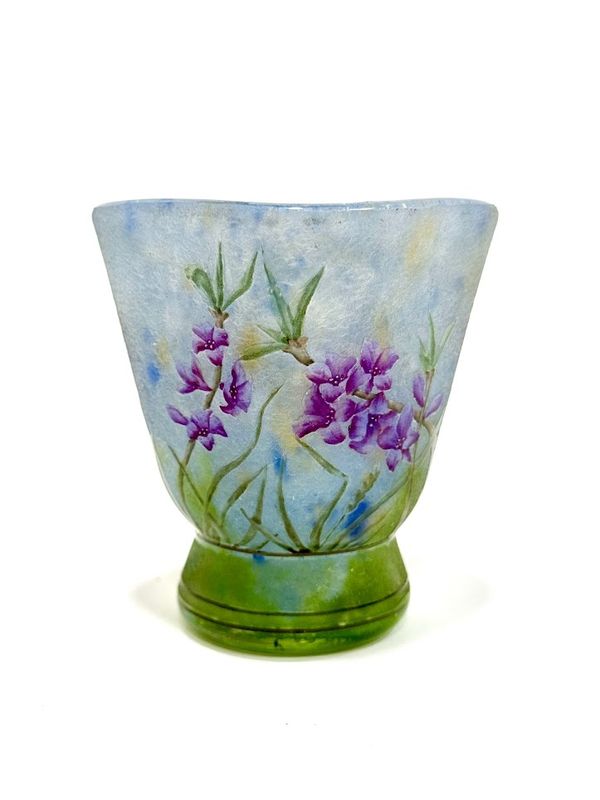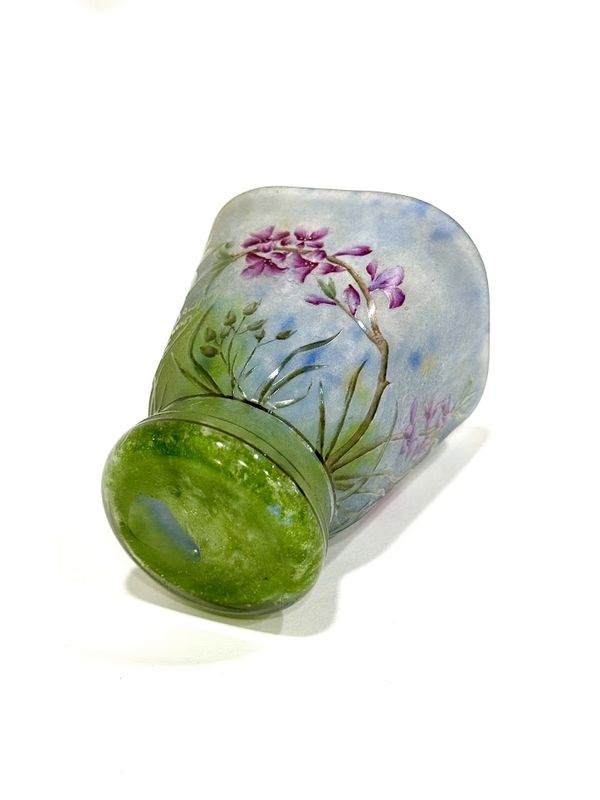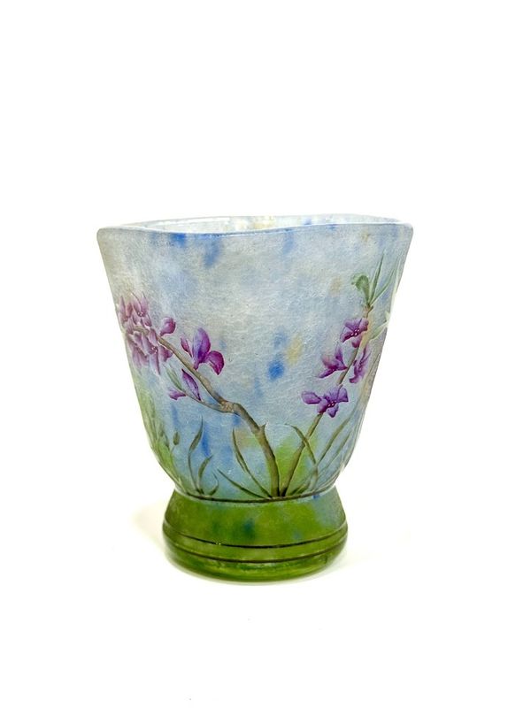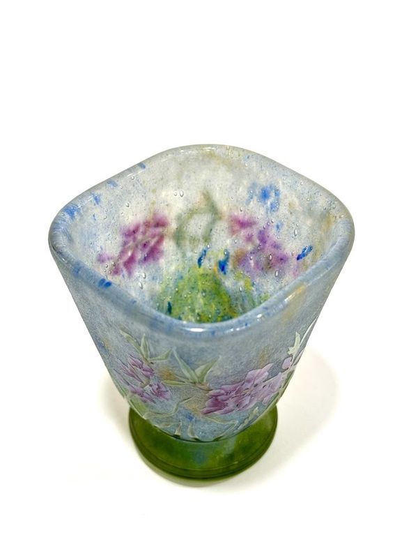 Charmant vase de section carré aux angles arrondis, reposant sur un talon circulaire en verre double. Superbe décor gravé en fines réserves à l'acide et peint aux émaux polychromes, de branches de Daphnés fleuris sur un fond marmoréen opacifié et traité de poudres bleues, jaunes et vertes.