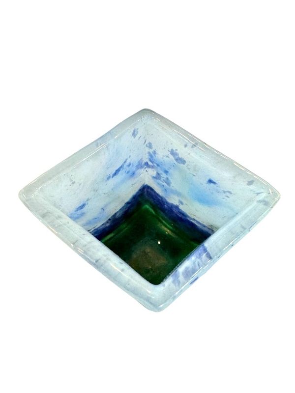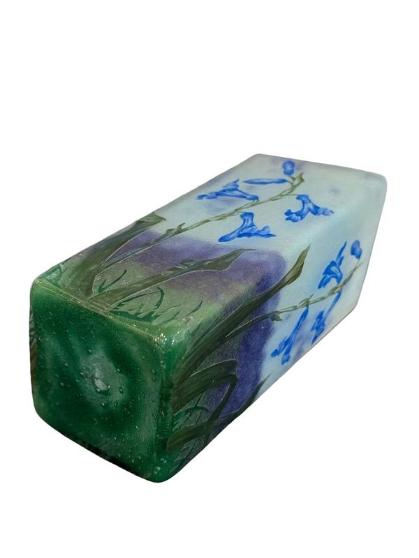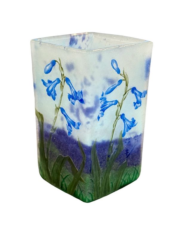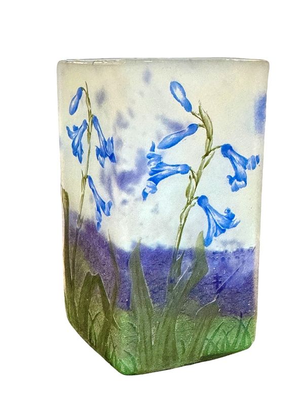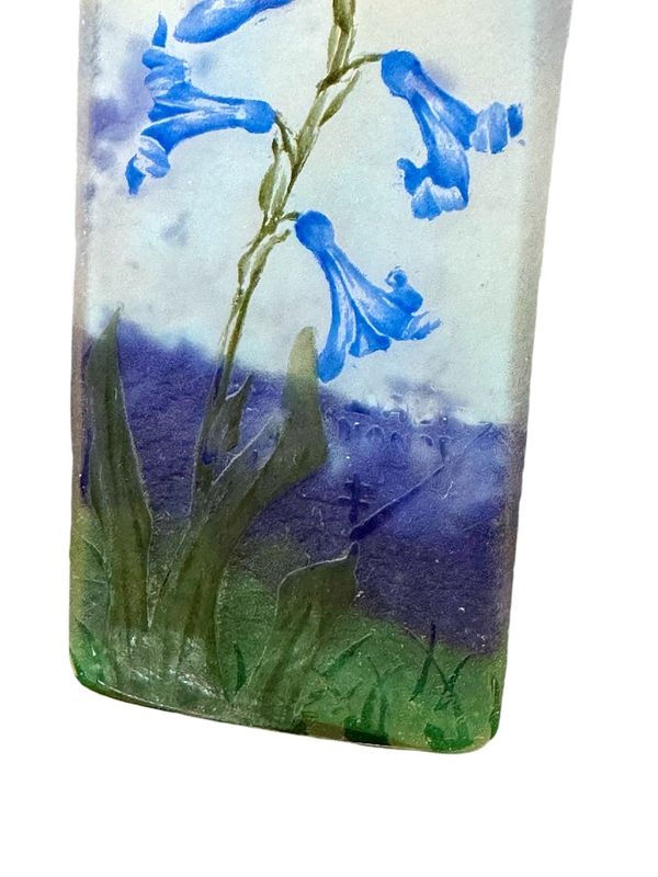 Joli vase de forme quadrangulaire en verre double à inclusion de poudre bleue et verte. Décor finement gravé et émaillé de fleurs de gentianes sur un fond givré et opacifié blanc. Signature  Daum Nancy à la croix de Lorraine. Belle qualité de réalisation !