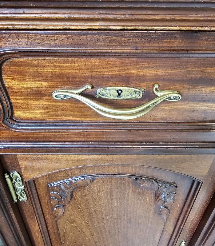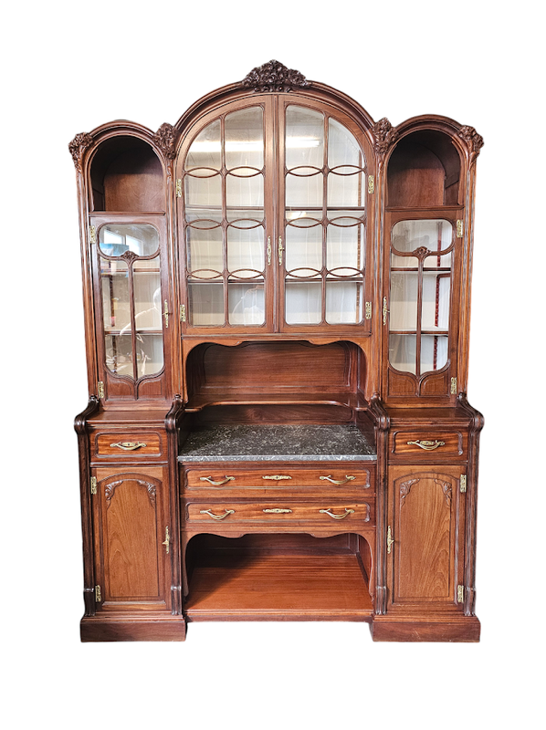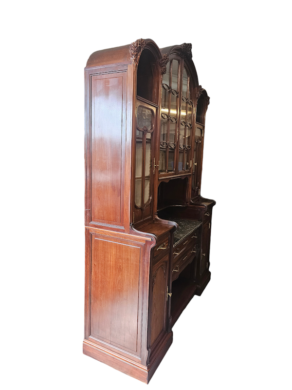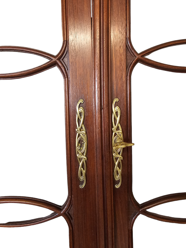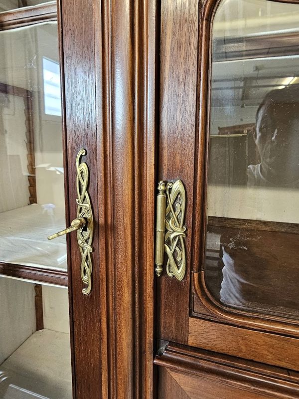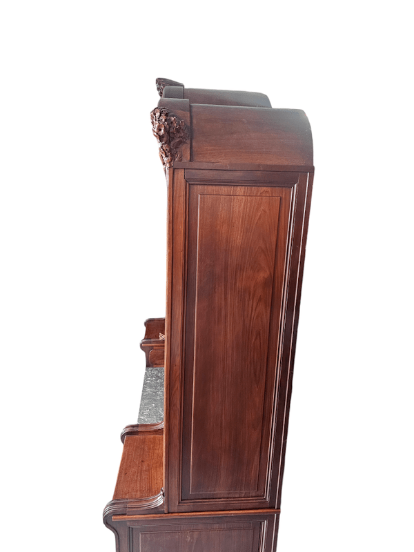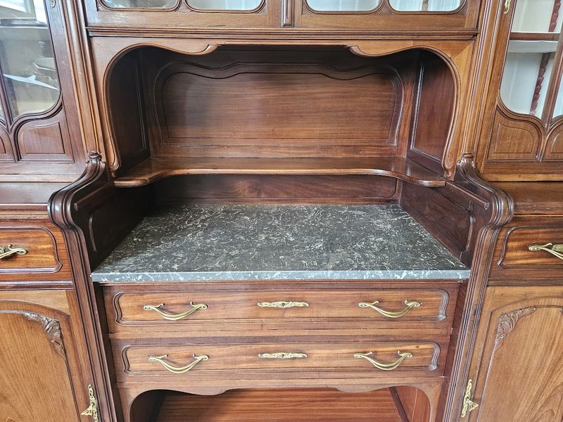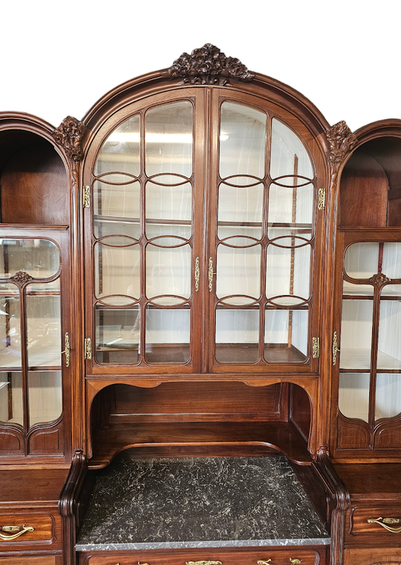 Corniche galbée à découpes chantournées, vitres parées de croisillons arrondis, tablette en marbre gris Biglio, poignées et entrées de serrures en bronze doré.