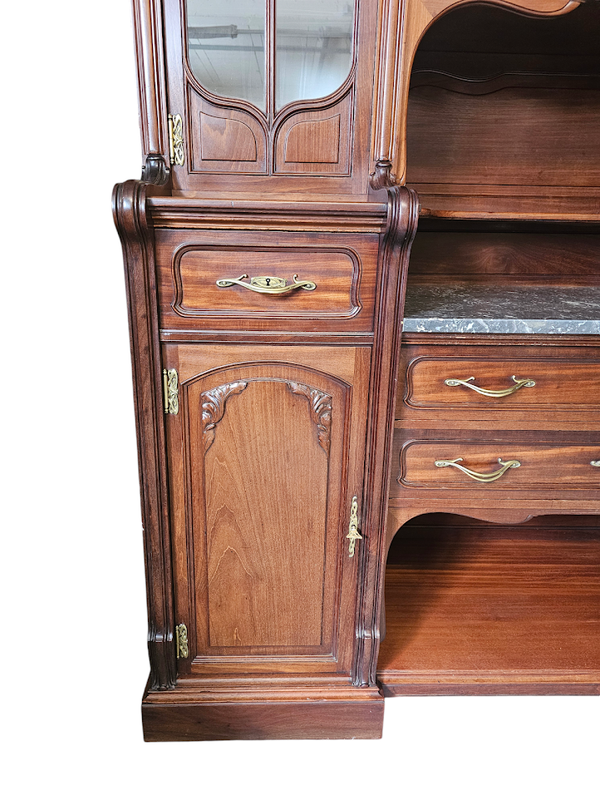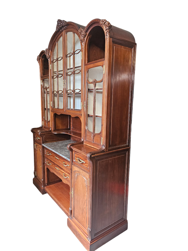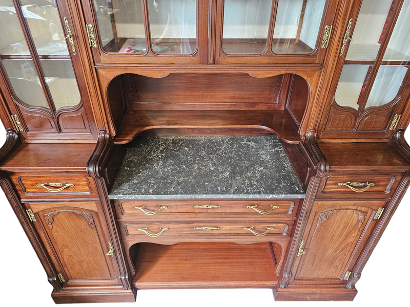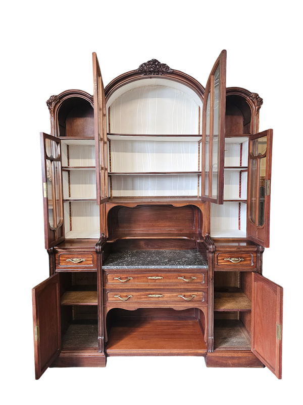 Elle ouvre par quatre portes vitrées, quatre tiroirs et quatre niches.