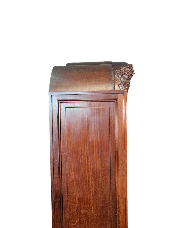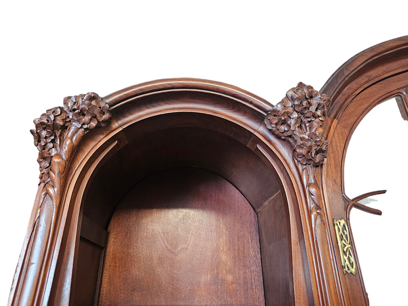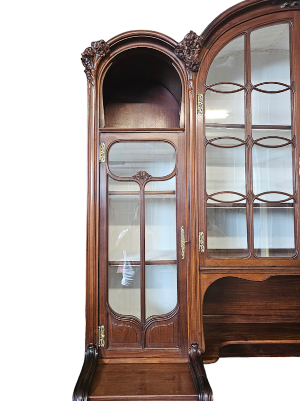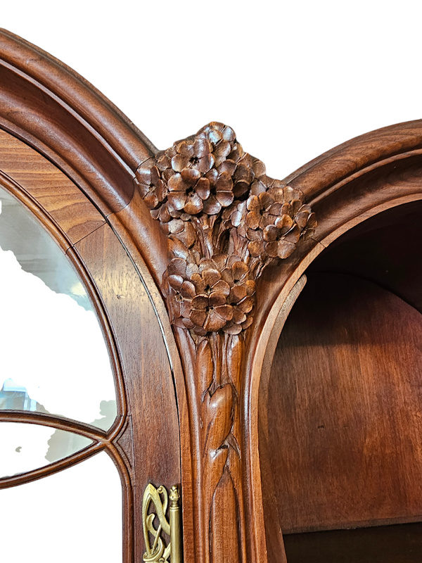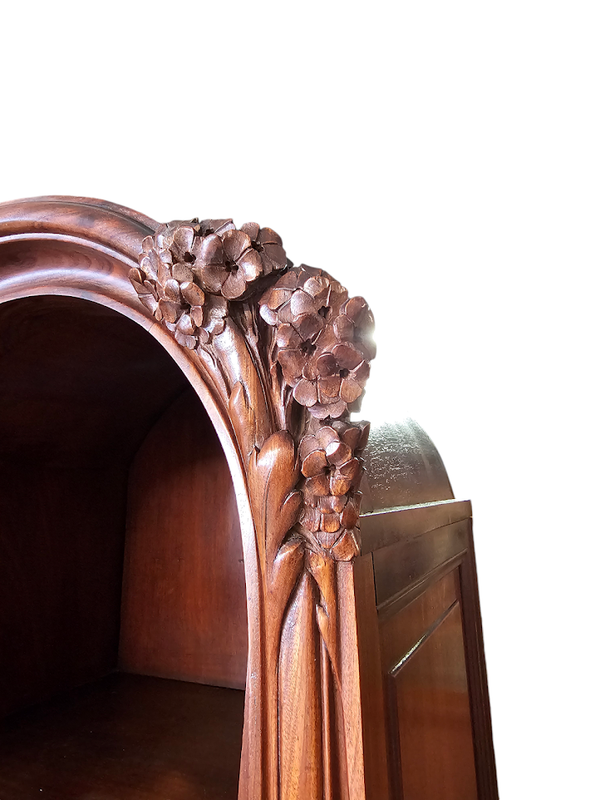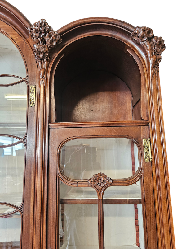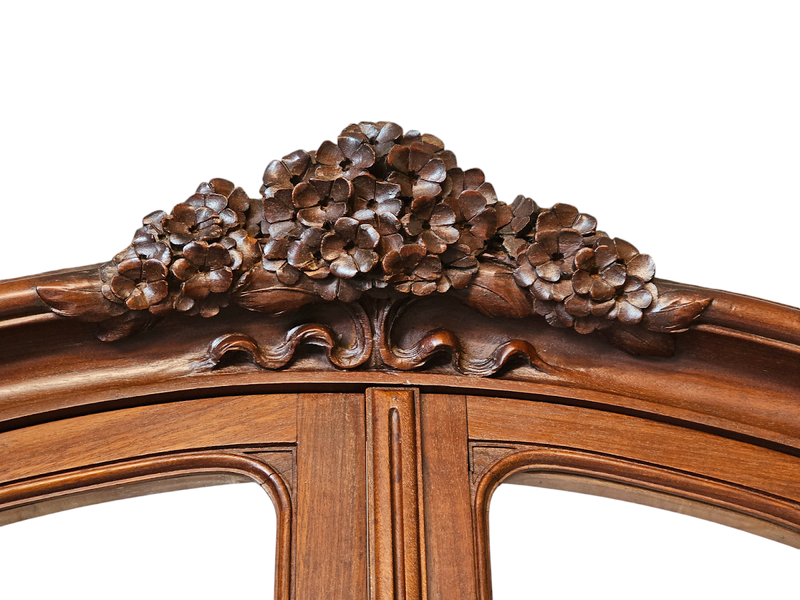Importante bibliothèque en acajou blond massif mouluré et finement sculpté à décor d'hortensias.