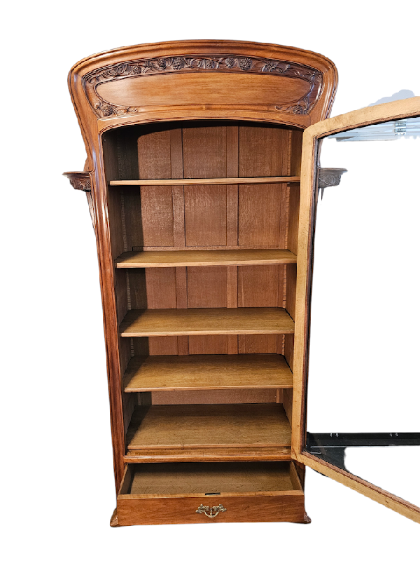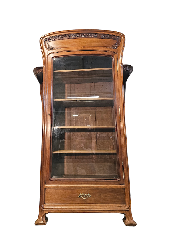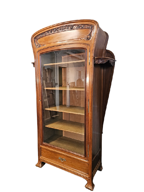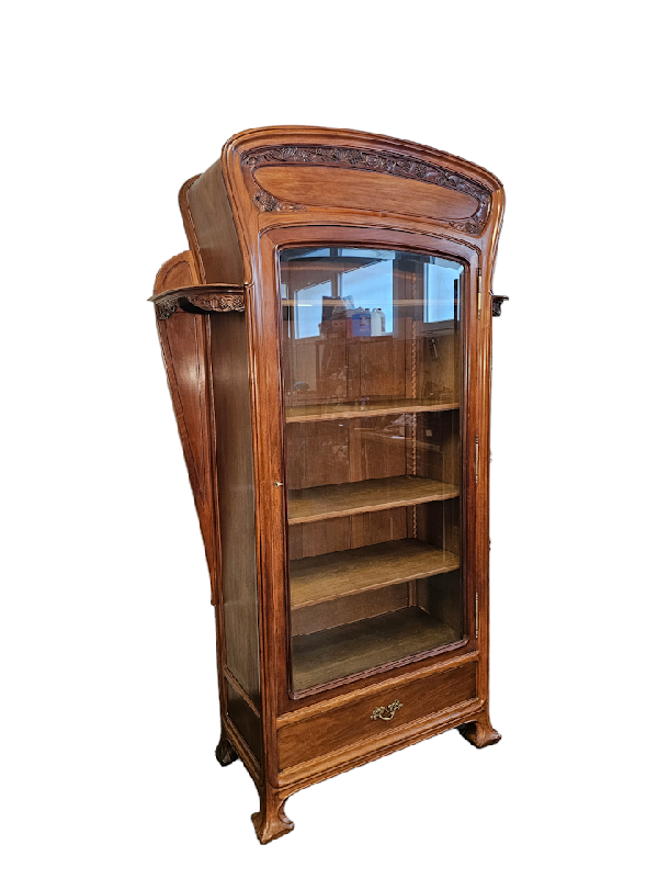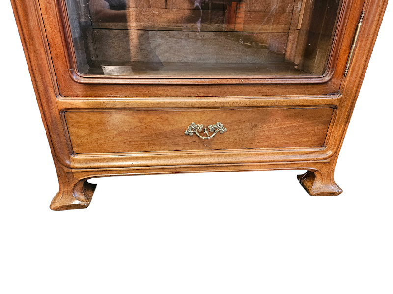Elle ouvre par une porte vitrée et un tiroir, les cotés sont galbés et présentent deux rayonnages arrondis, la corniche est cintrée, elle repose sur quatre pieds débordants.