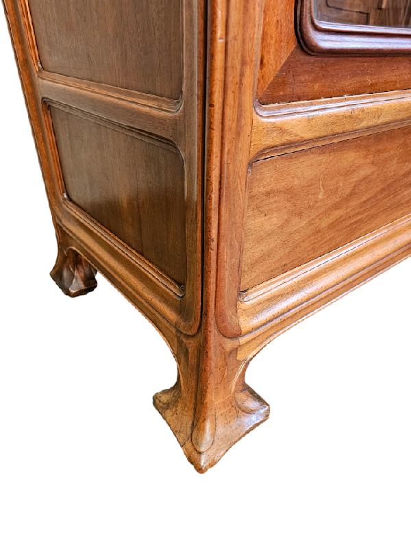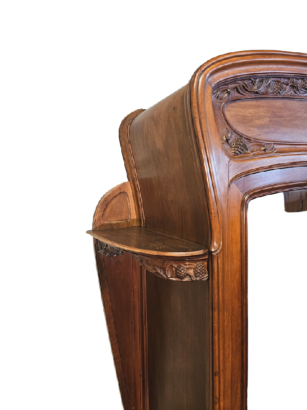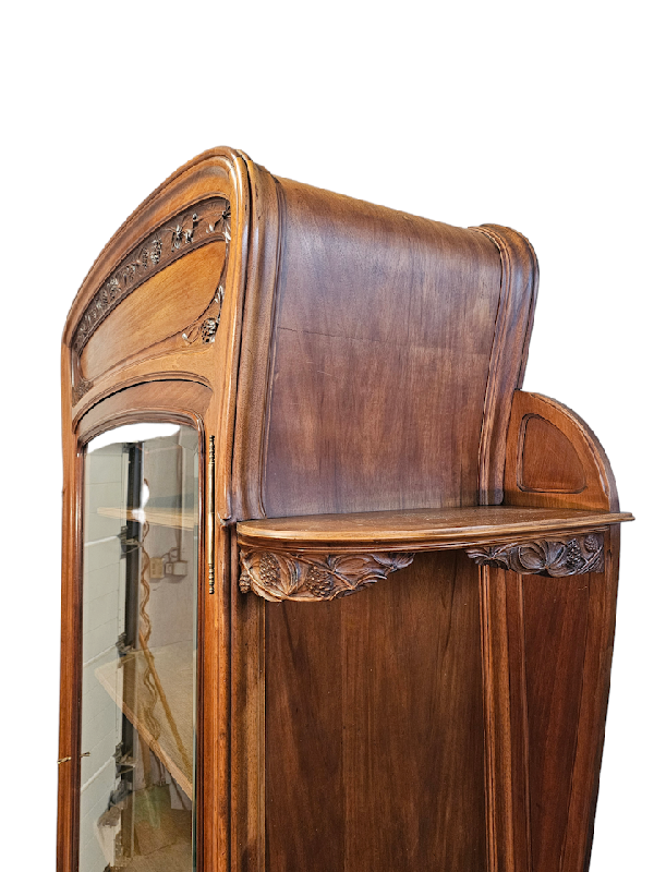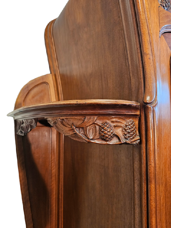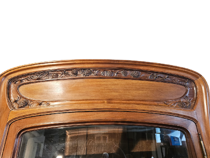 Belle vitrine à oreilles en noyer mouluré et sculpté à décor de pommes de pin.
