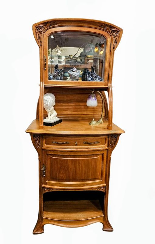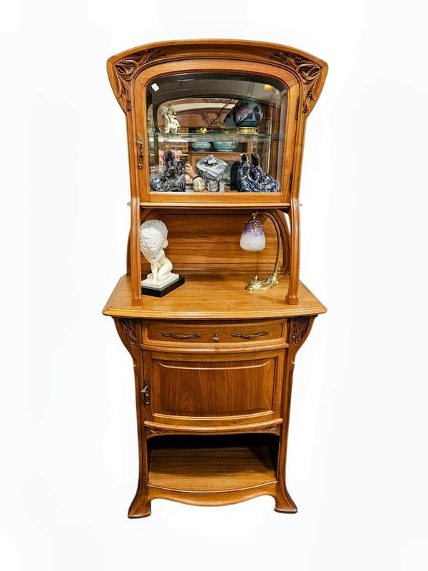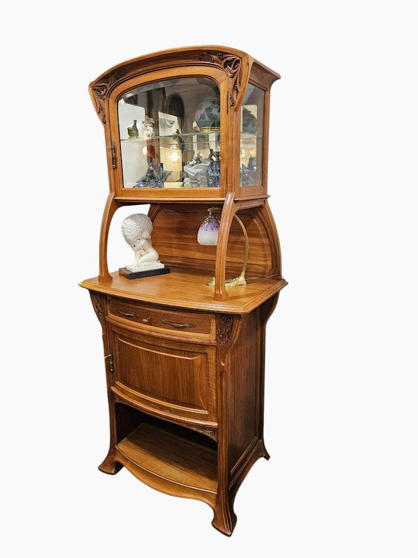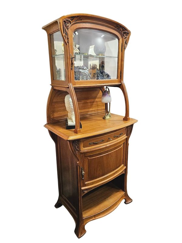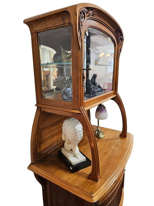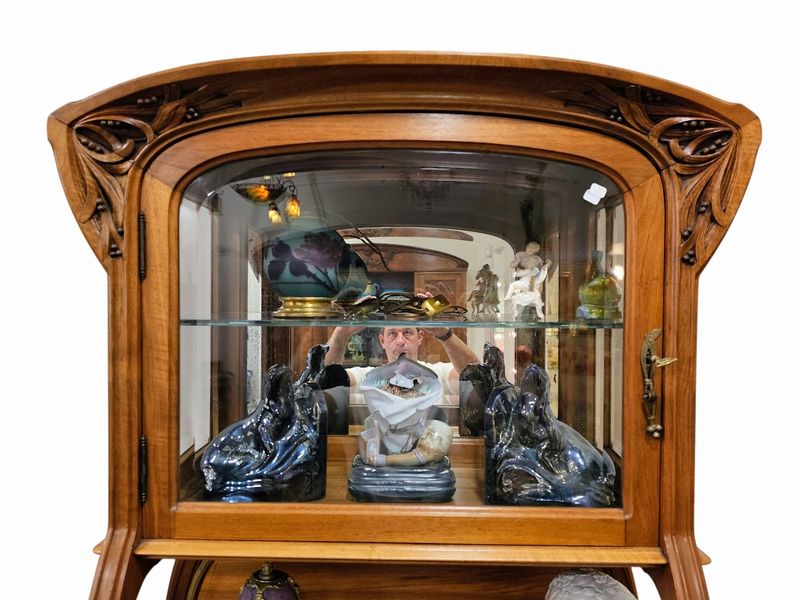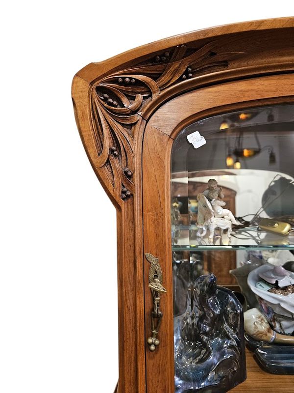 Rare vitrine de collectionneur en noyer massif mouluré et sculpté à décor de sureau.