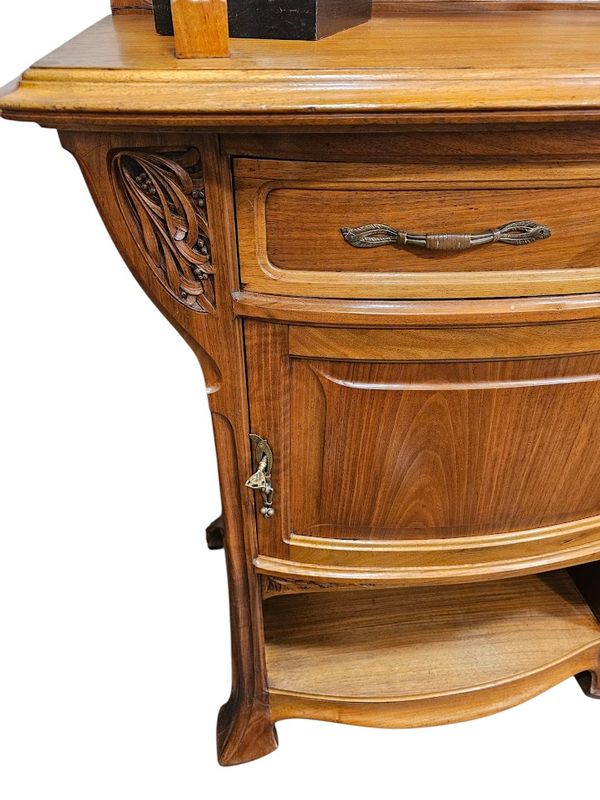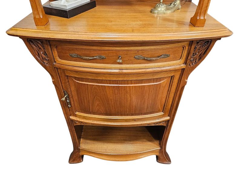 La partie basse est profondément galbée, elle ouvre par un tiroir, une porte panneautée et une niche, elle repose sur un piétement angulaire débordant.