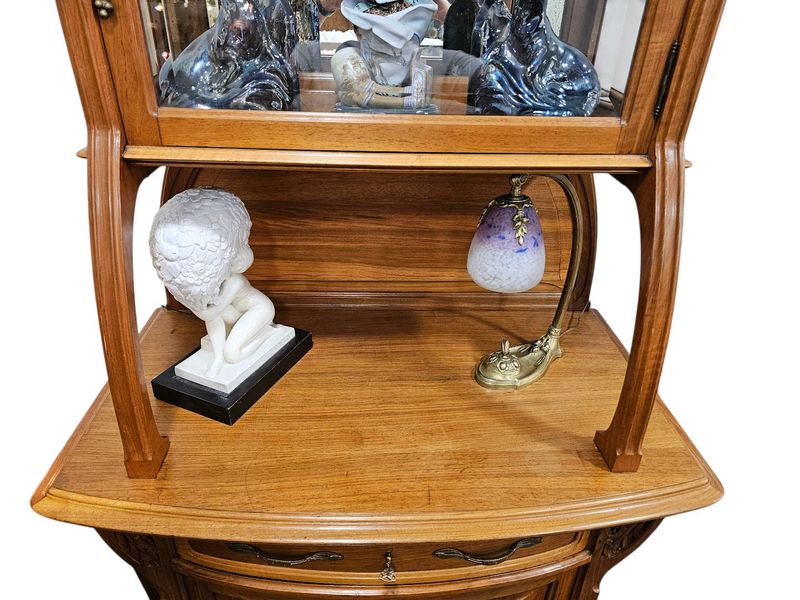 La vitrine est maintenue à l'avant par des montants arqués, elle présente une corniche cintrée et ouvre par une porte sur une étagère en verre et un fond équipé d'un miroir.