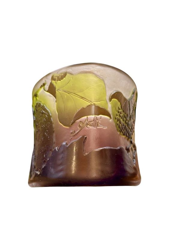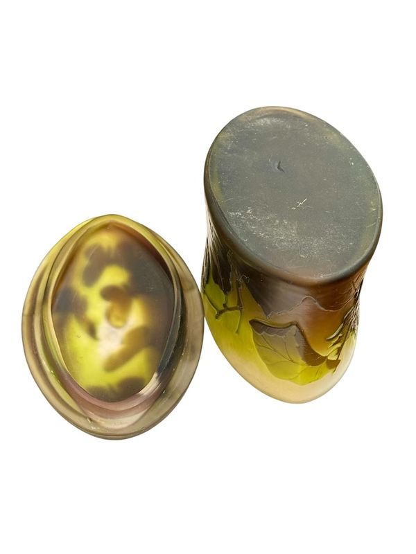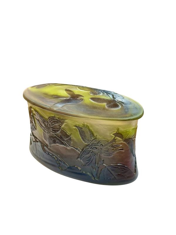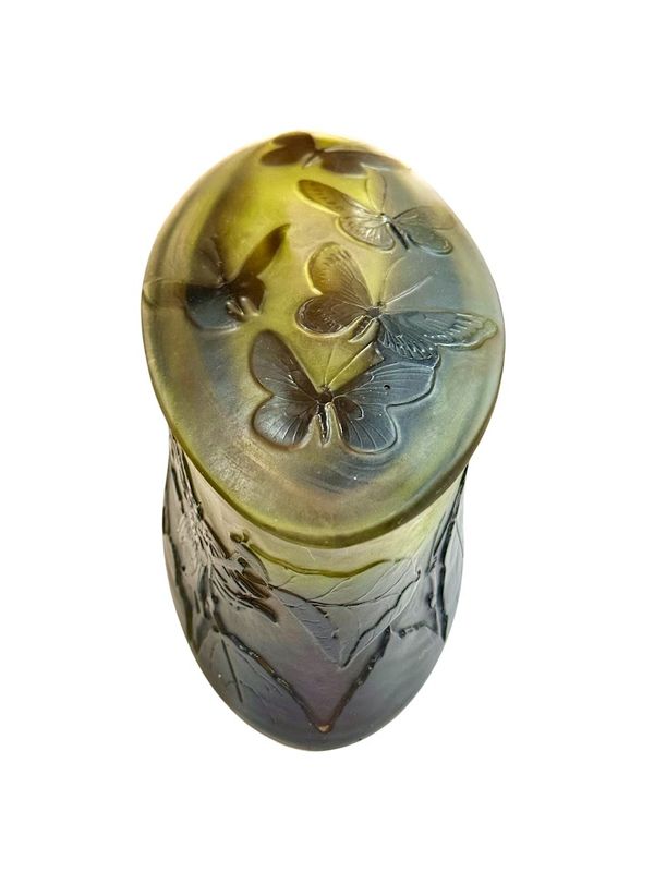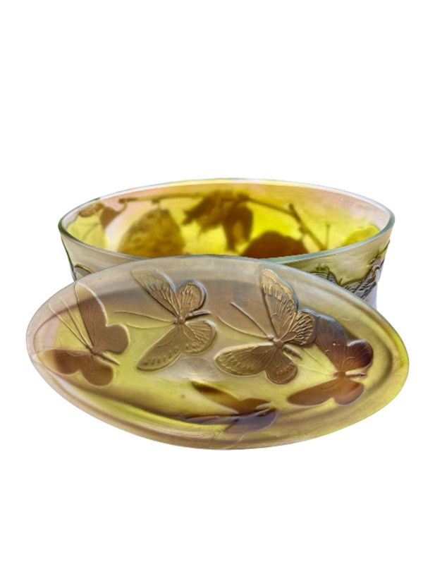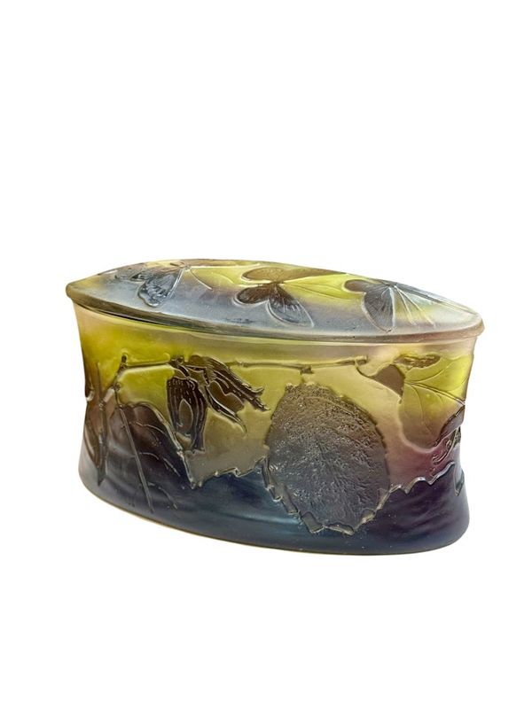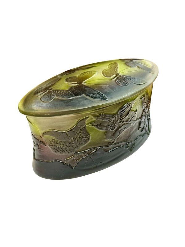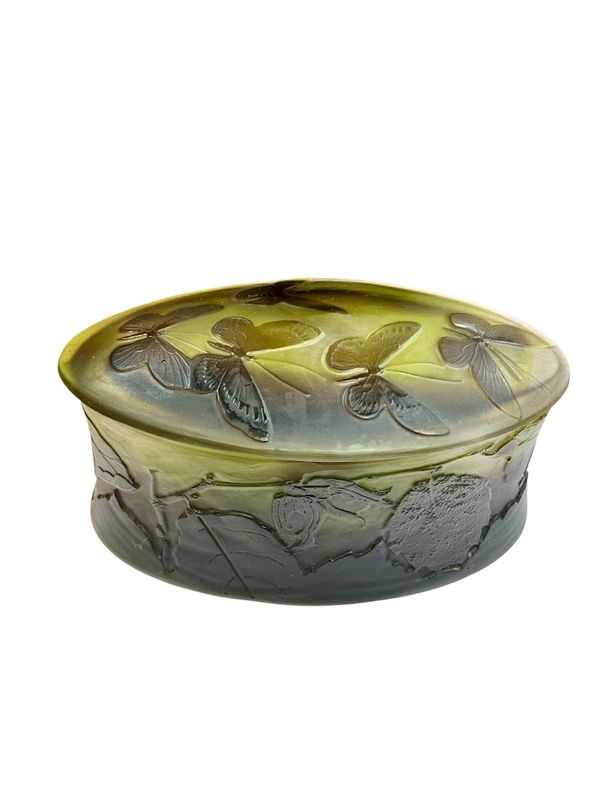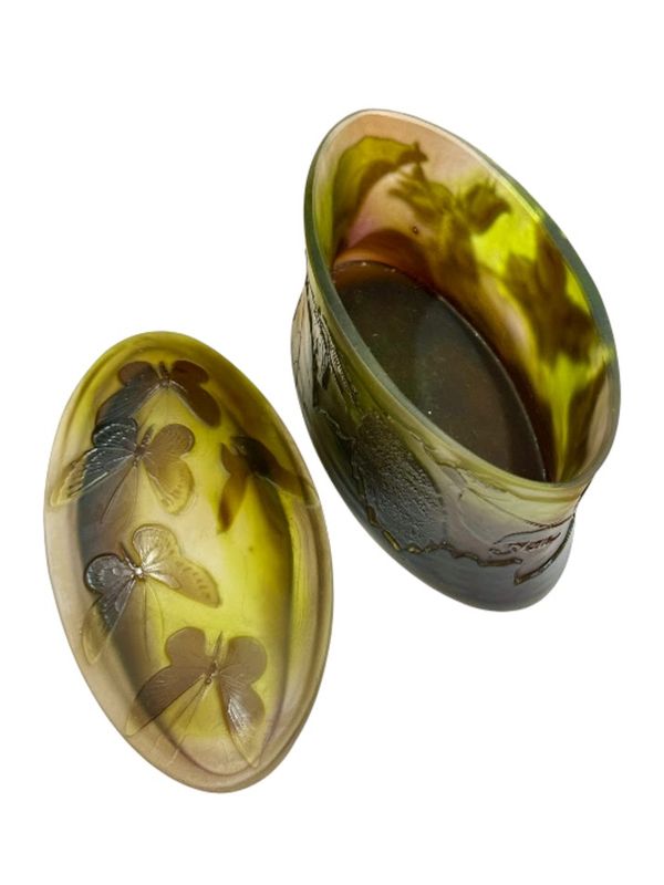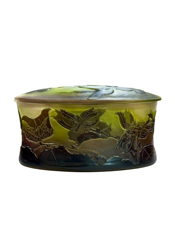Décor finement gravé en camée à l'acide de feuilles et de noisettes sur la base et de cinq papillons sur le couvercle, sur un fond satiné dans les tons verts et roses.