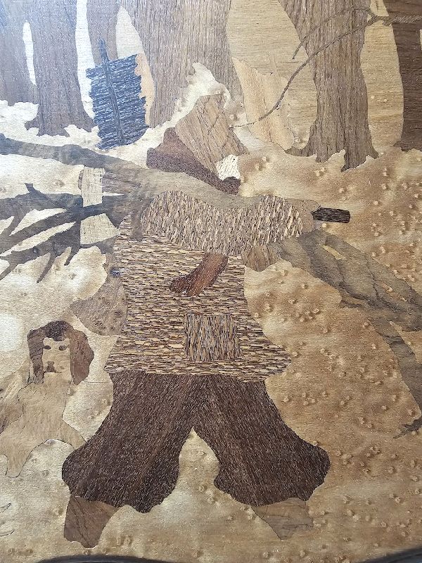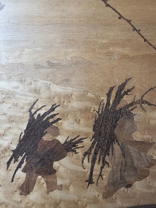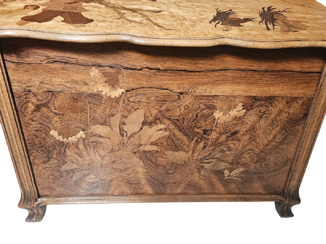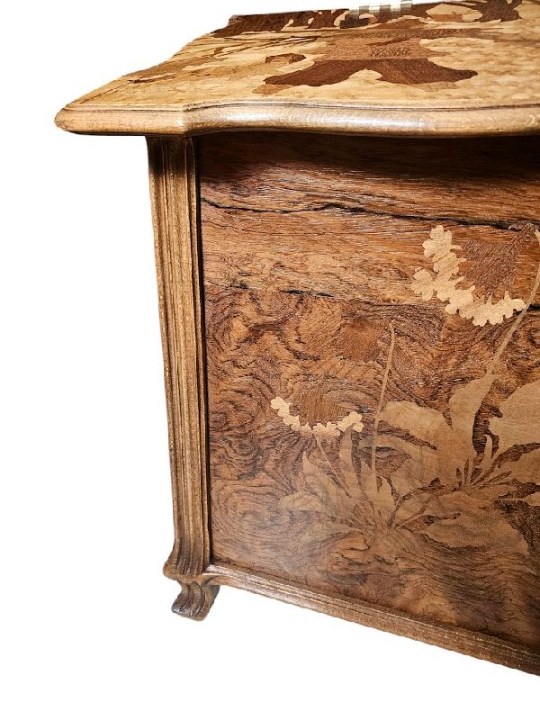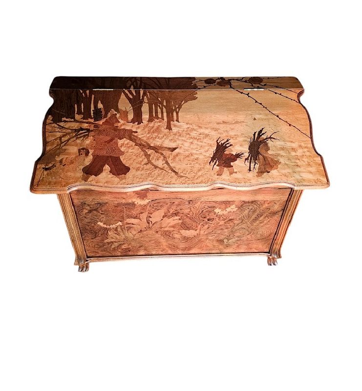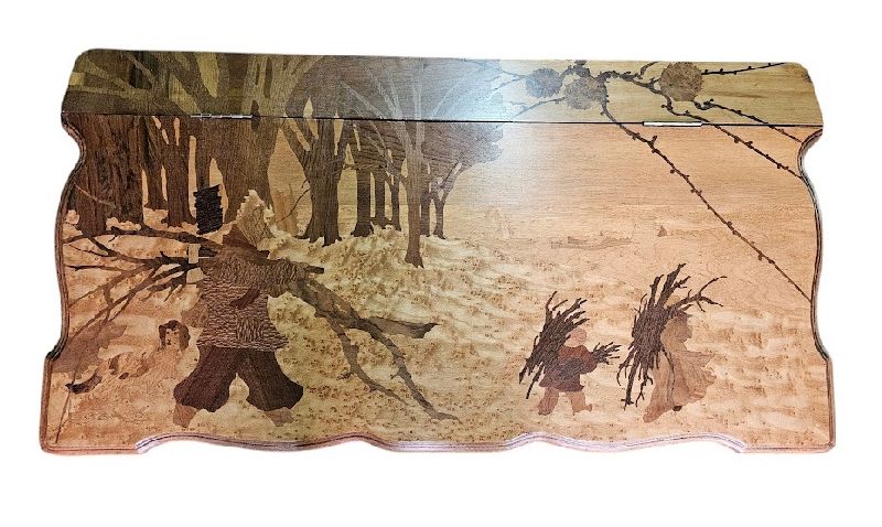 Superbe coffre en hêtre massif mouluré à riche décors marquetés, de personnages portants des fagots dans un paysage de sous-bois enneigé et de feuillages.