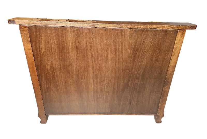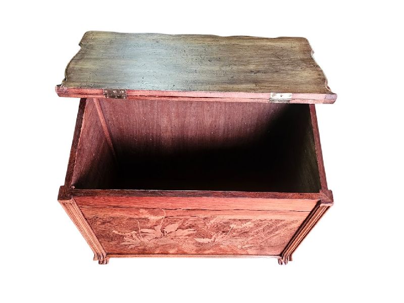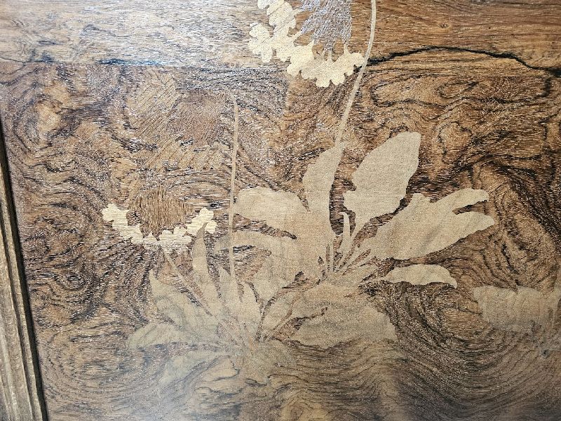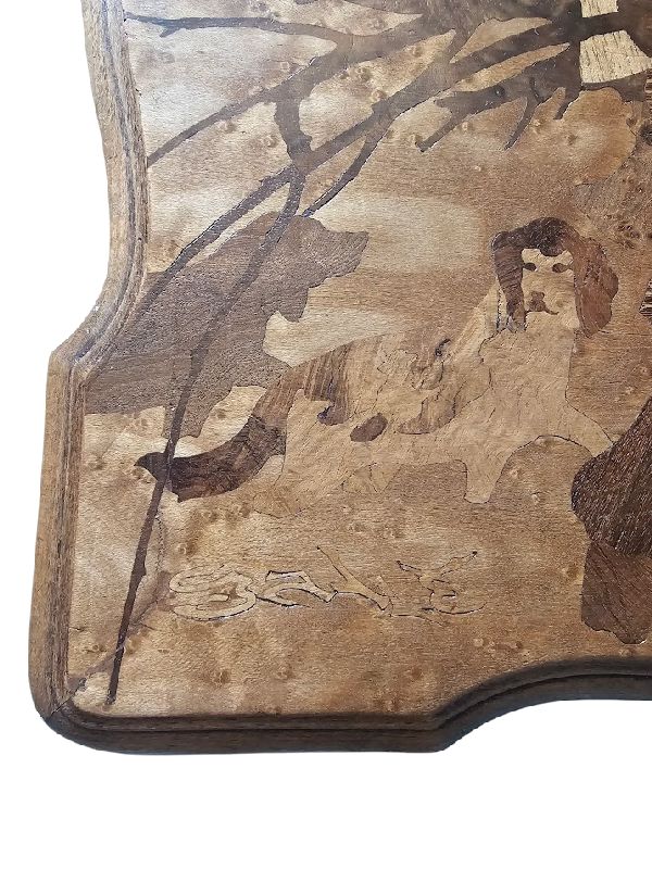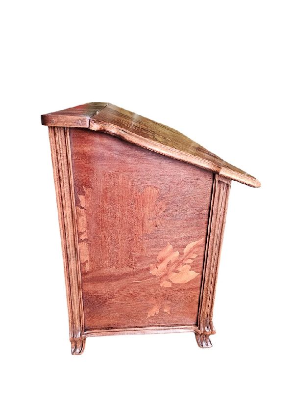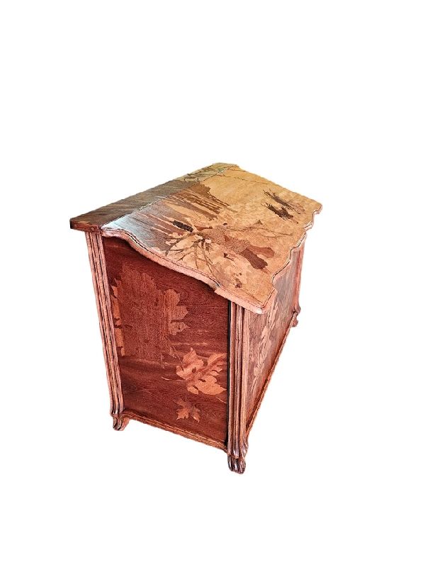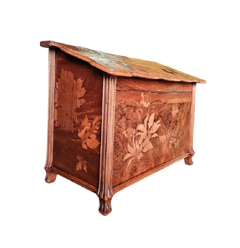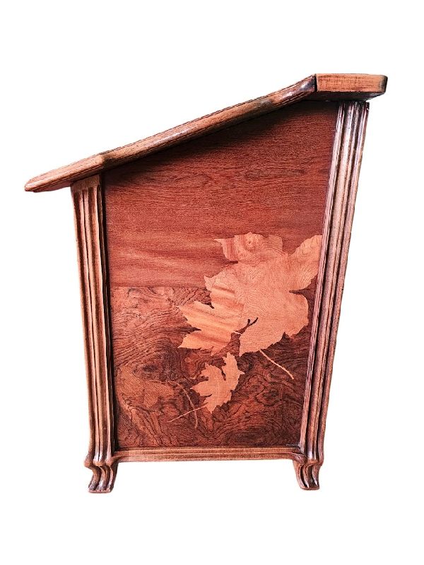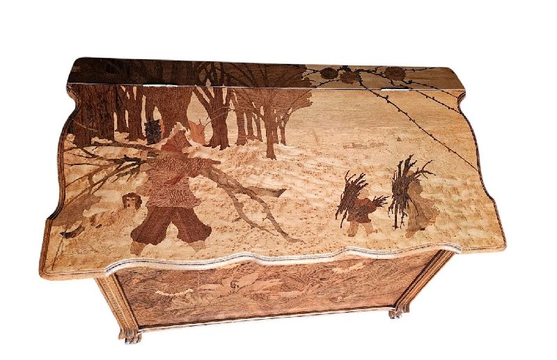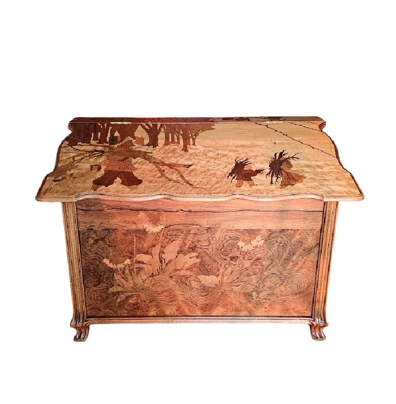 Il ouvre par un couvercle abattant à moulures chantournées, les montants sont sculptés en haut relief pour former le piétement, à noter la qualité de découpe et le choix des essences avec notamment une loupe d'érable pour illustrer les parties enneigées.