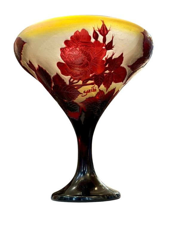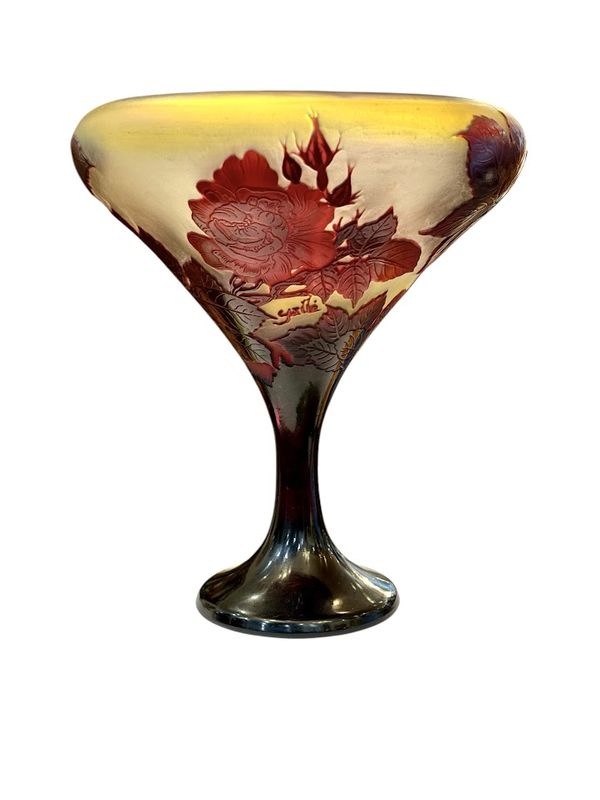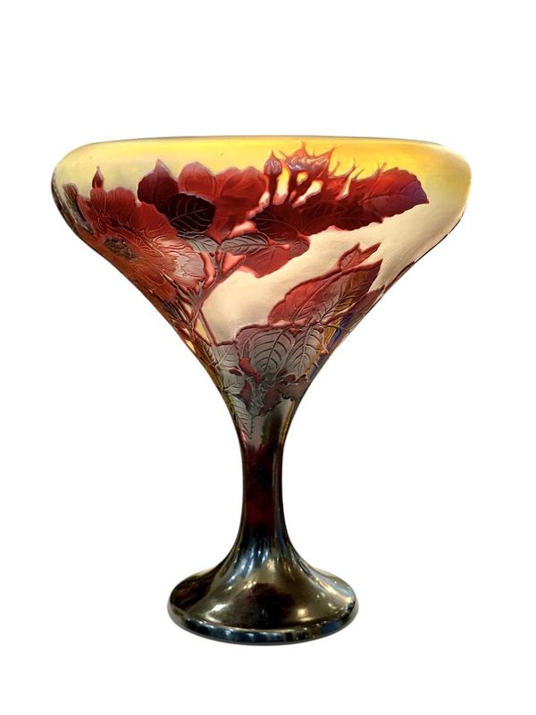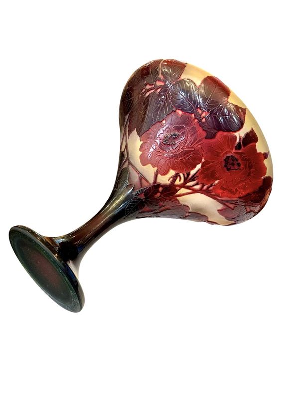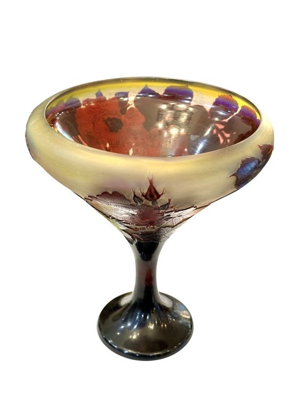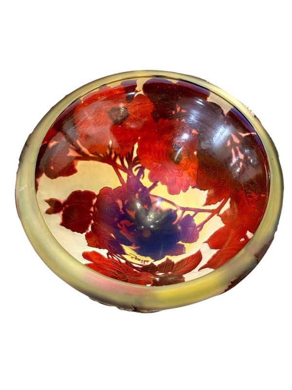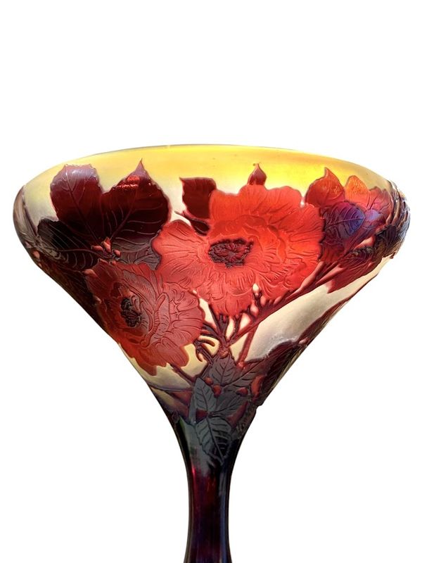 Superbe décor gravé en camée à l'acide de fleurs de roses trémières et de feuillage sur un fond opacifié et satiné de jaune.