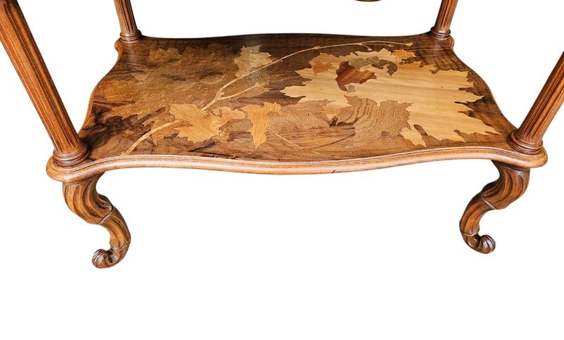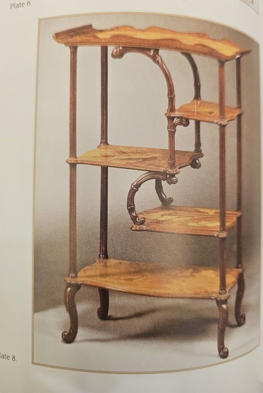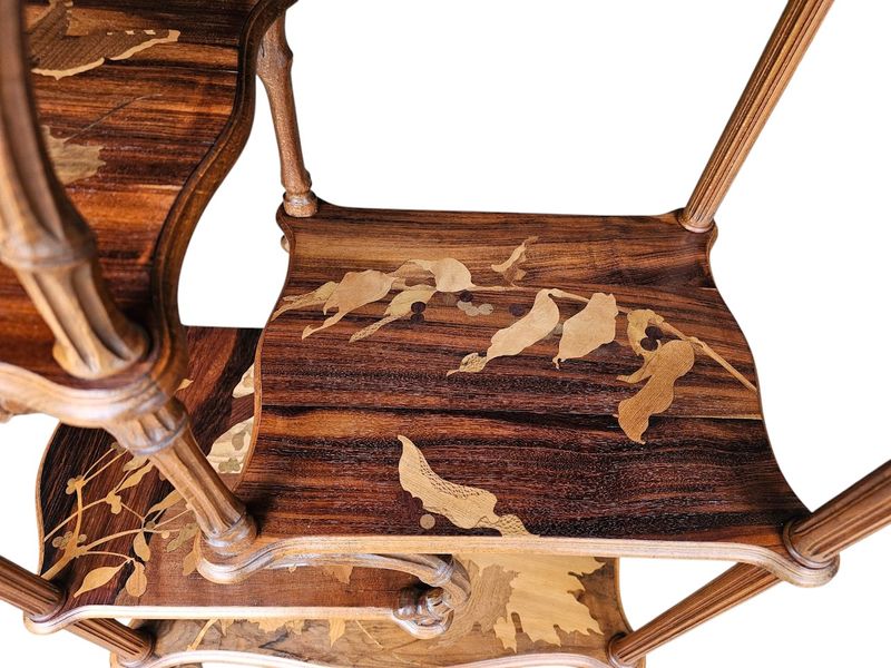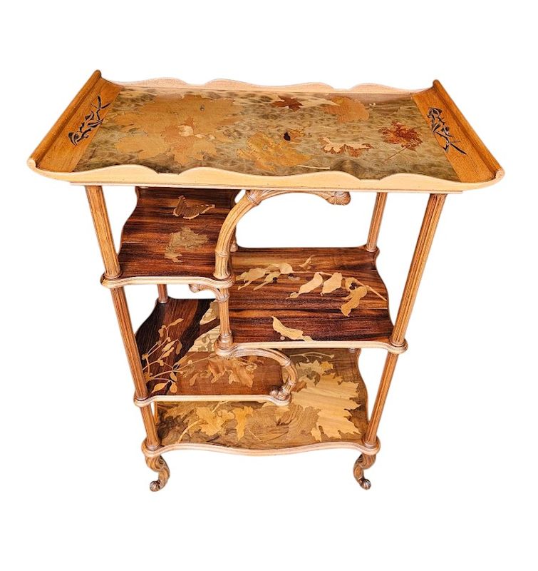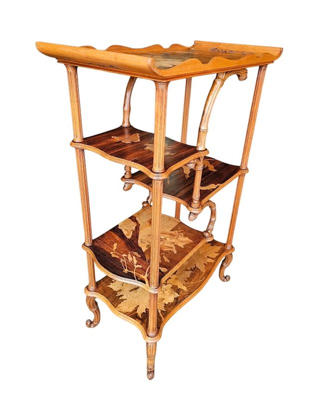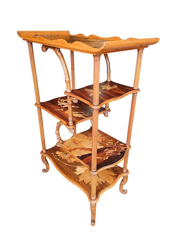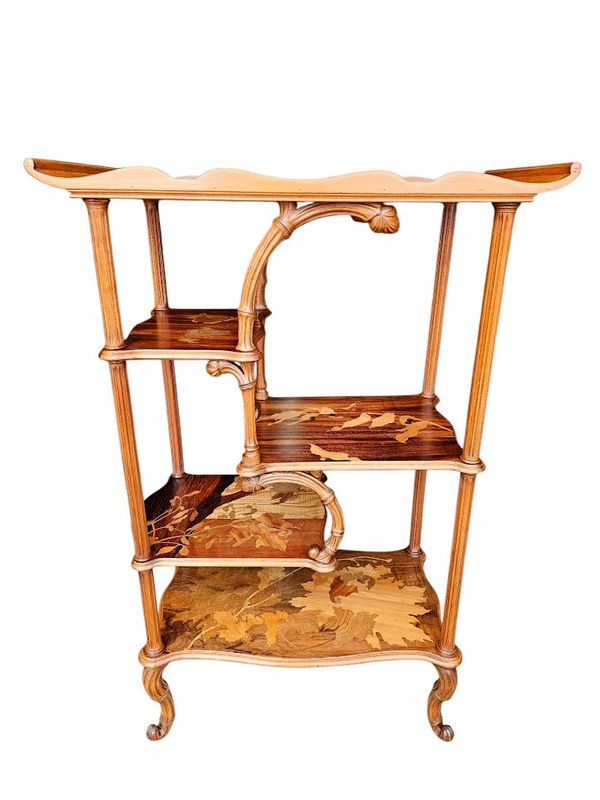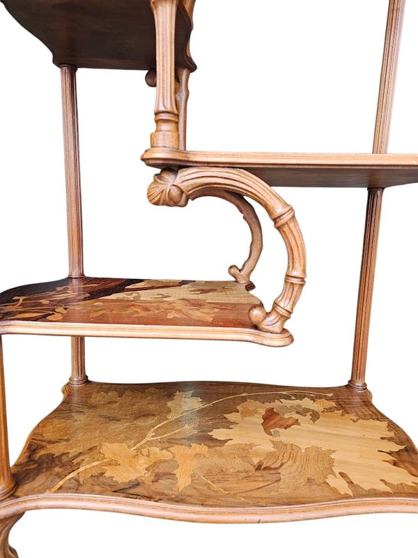 Le plateau supérieur présente des alèses cintrées et ajourées, les trois plateaux centraux sont maintenus par des montants à décor de roseaux, le plateau inférieur repose sur quatre pieds galbés d'inspiration végétale.
