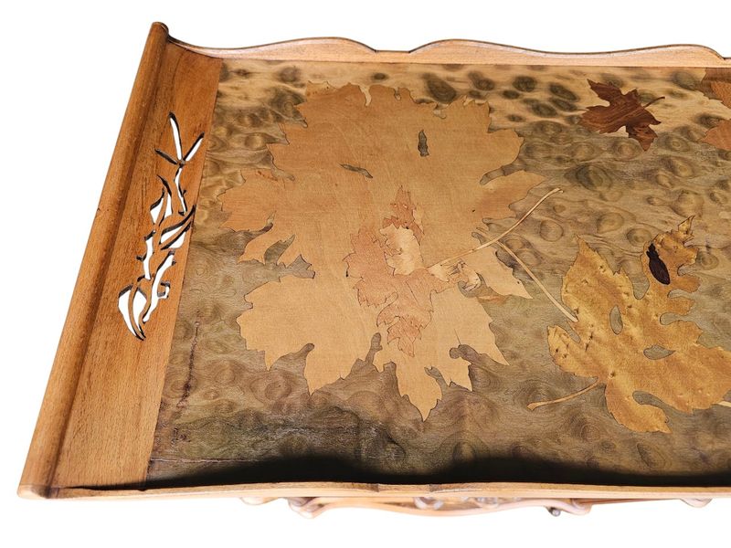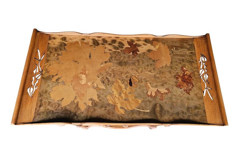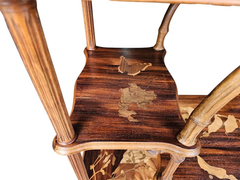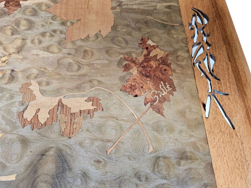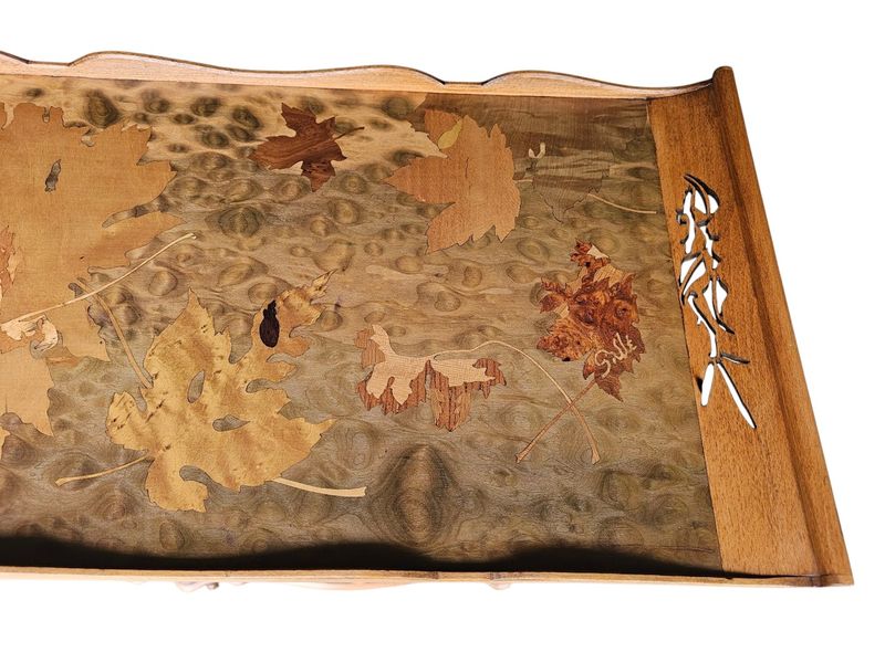 Elle présente des décors marquetés de feuillages, fleurs papillon et insectes.
