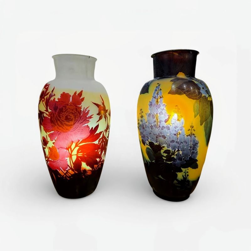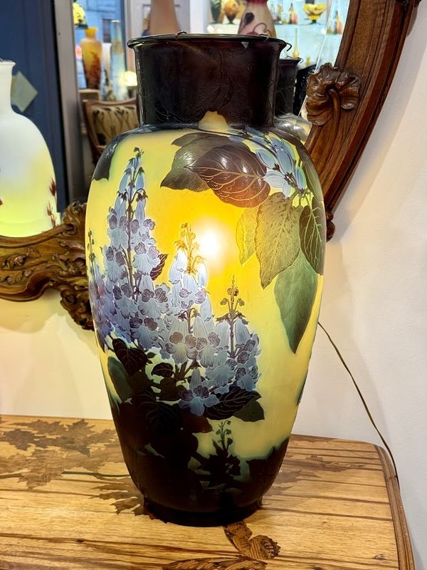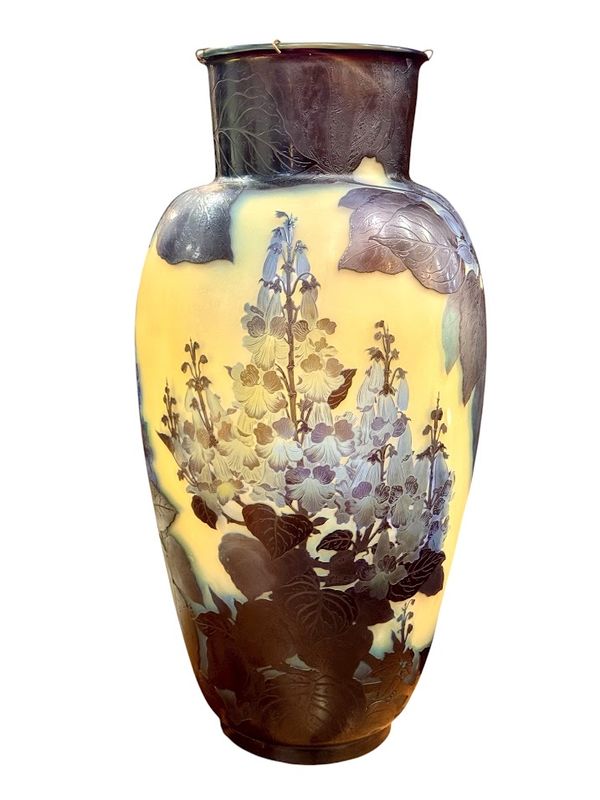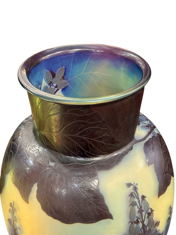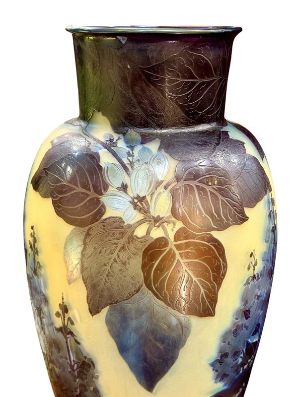 Monumental vase balustre en verre triple sur talon à large épaulement et col cheminée arrondi. Magnifique décor finement gravé en camée à l'acide de feuillages et de branches dans des tons dégradés violets et verts, de fleurs de paulownia bleues-mauves, le tout sur un fond uniformément jaune satiné. Il dispose d'un système éclairant amovible. Superbe rendu lumineux! Emile Gallé à Nancy Circa 1920