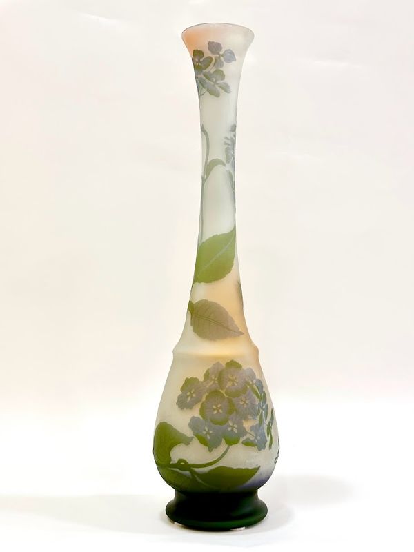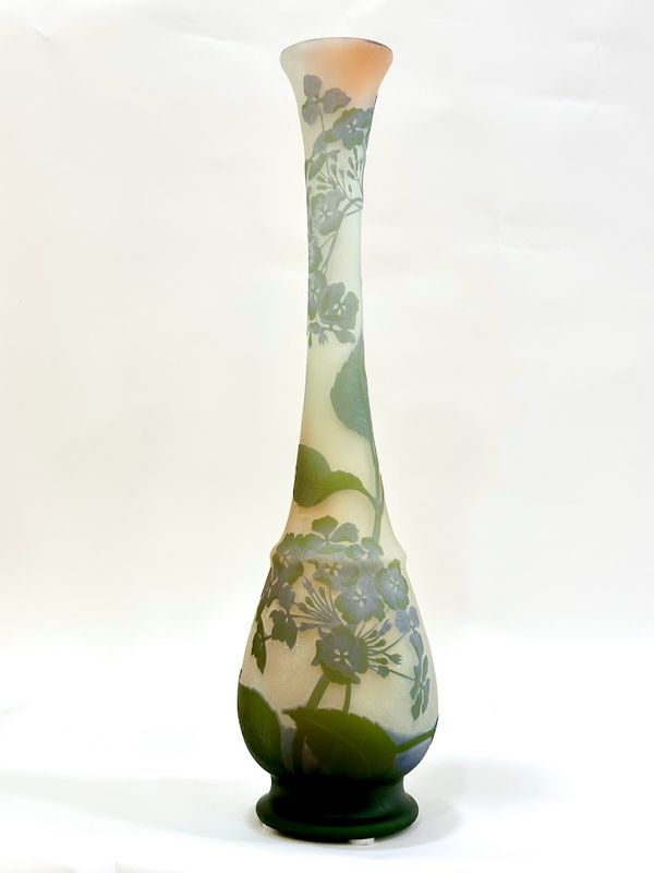 Important vase en verre double de forme conique à long col, décor finement gravé en camée de fleurs d'hortensias et de feuillages, dans les tons pastels de verts et mauves,  sur un fond satiné de blanc et rose. Belle signature de Gallé à l'étoile sur la panse. Belle qualité de réalisation !