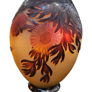 Superbe décor gravé en fines réservés à l'acide et partiellement poli, de papillons en volent, de feuillages stylisés et de tulipes, sur un fond opacifié et nuancé de blanc, d'orange et de rose.