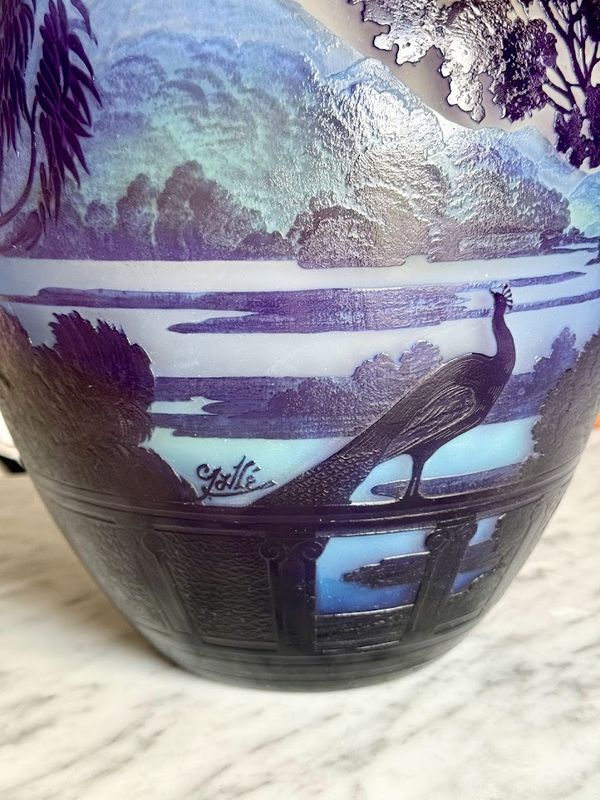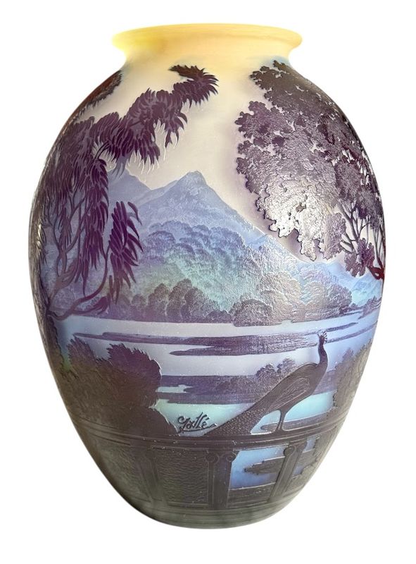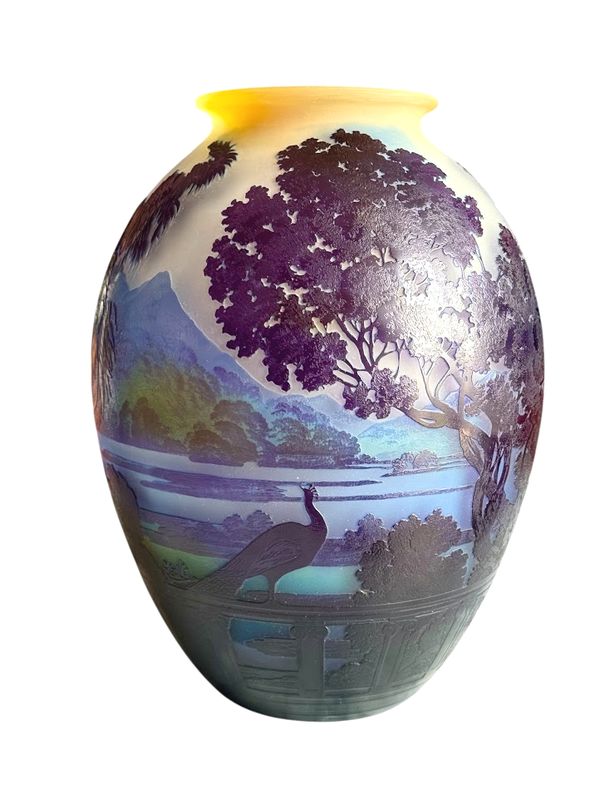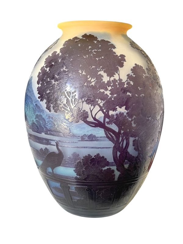 Superbe décor tournant gravé en fines réserves à l'acide, illustrant le lac de Come animé au premier plan d'un paon sur une balustrade.