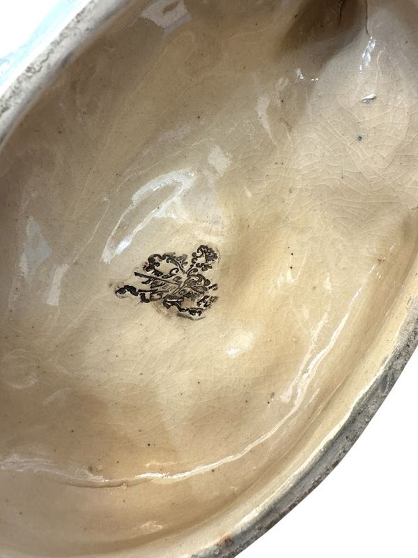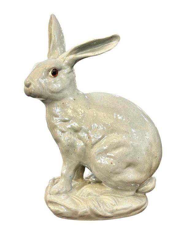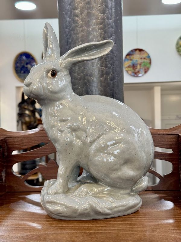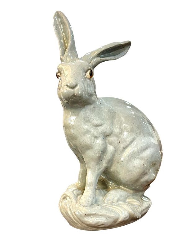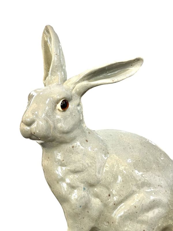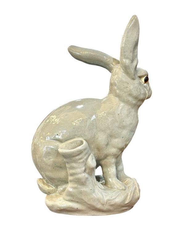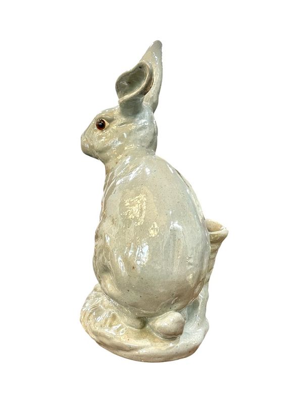 Rare lapin porte bouquet de Gallé aux yeux en sulfure, en céramique émaillée polychrome, dans les tons de gris tacheté. Jolie signature en écusson "Emile Gallé Fayencerie Nancy" sous la terrasse.