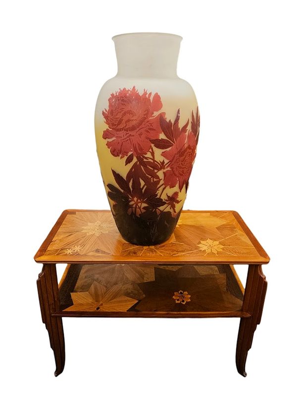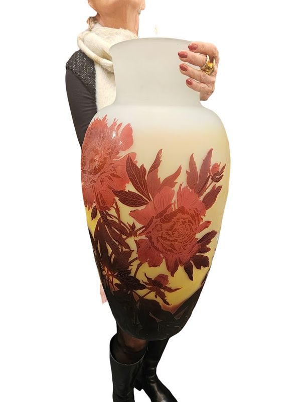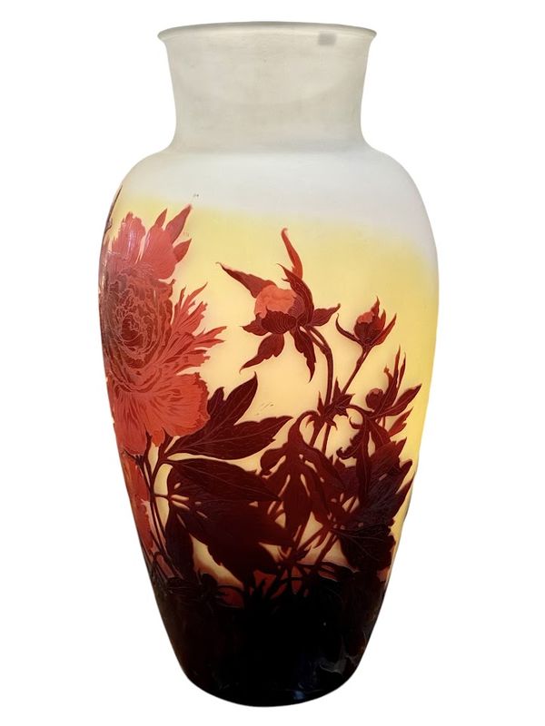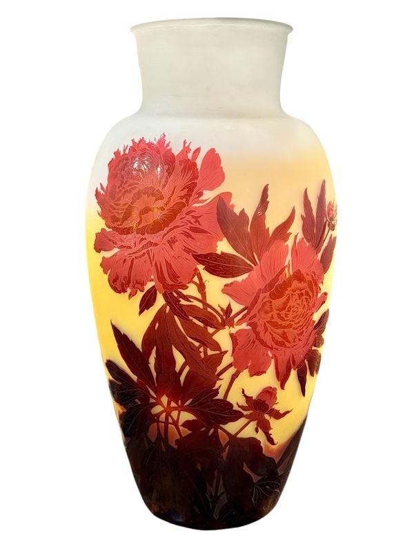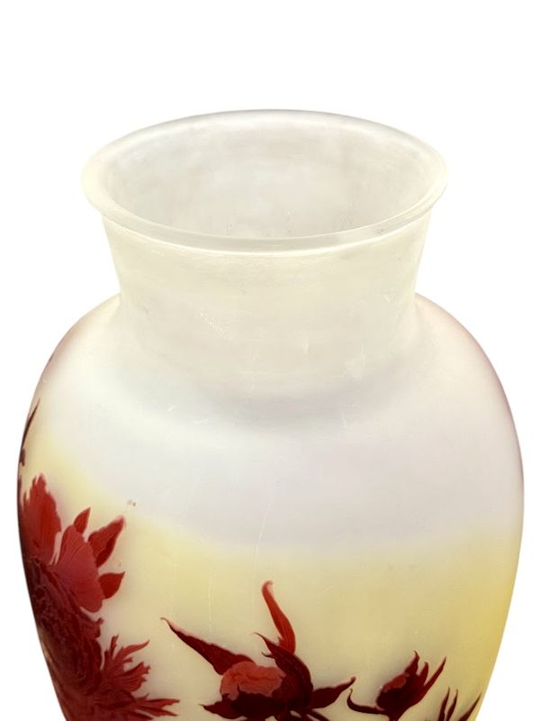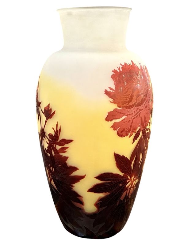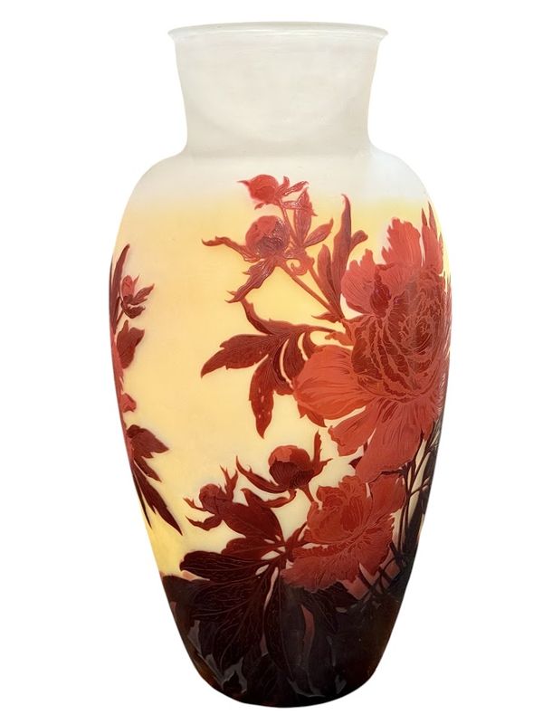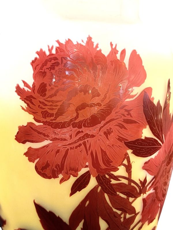 Magnifique décor finement gravé en camée à l'acide de feuillages et de branches dans des tons dégradés bordeaux, de fleurs de pivoines rouges , le tout sur un fond satiné jaune et blanc.