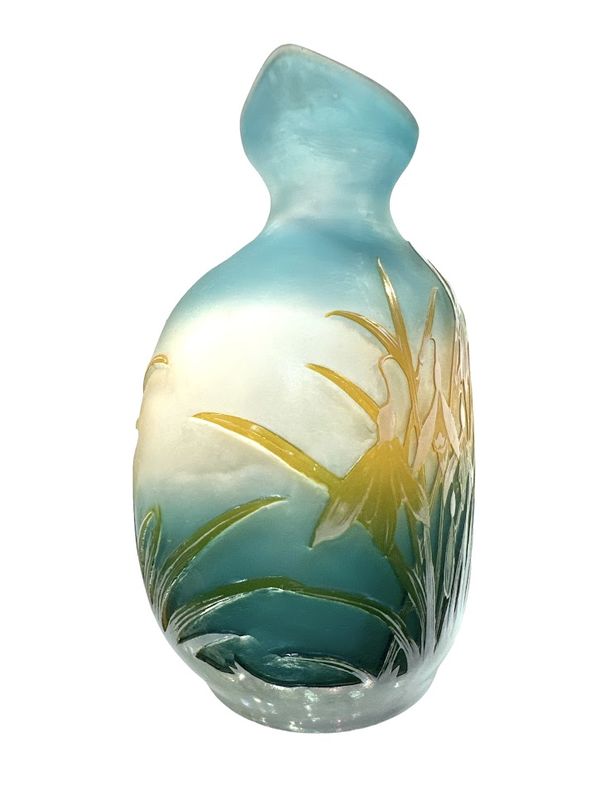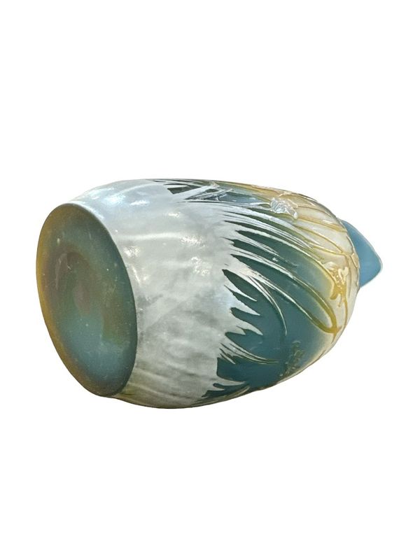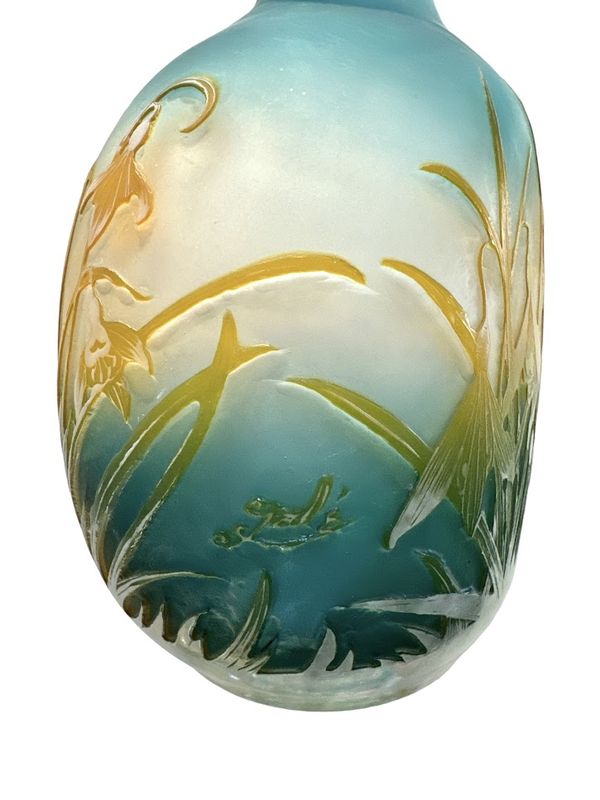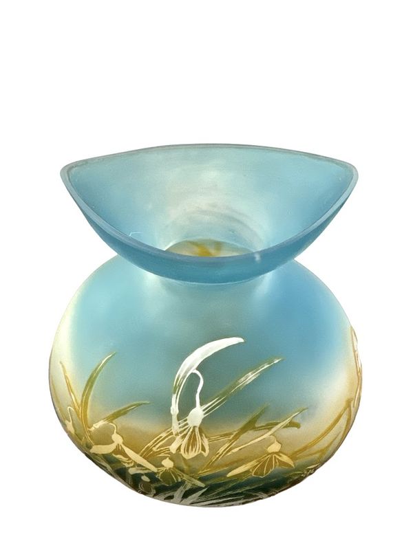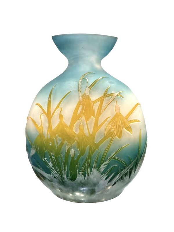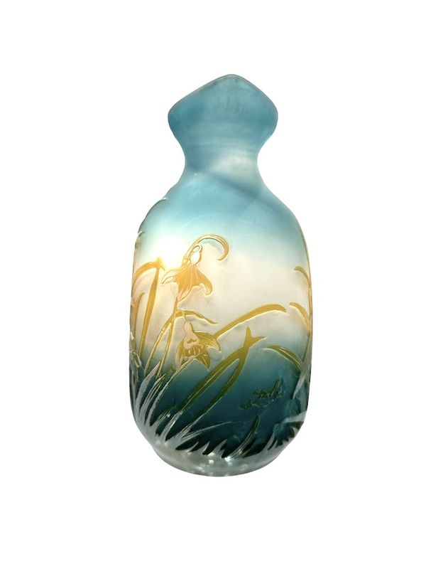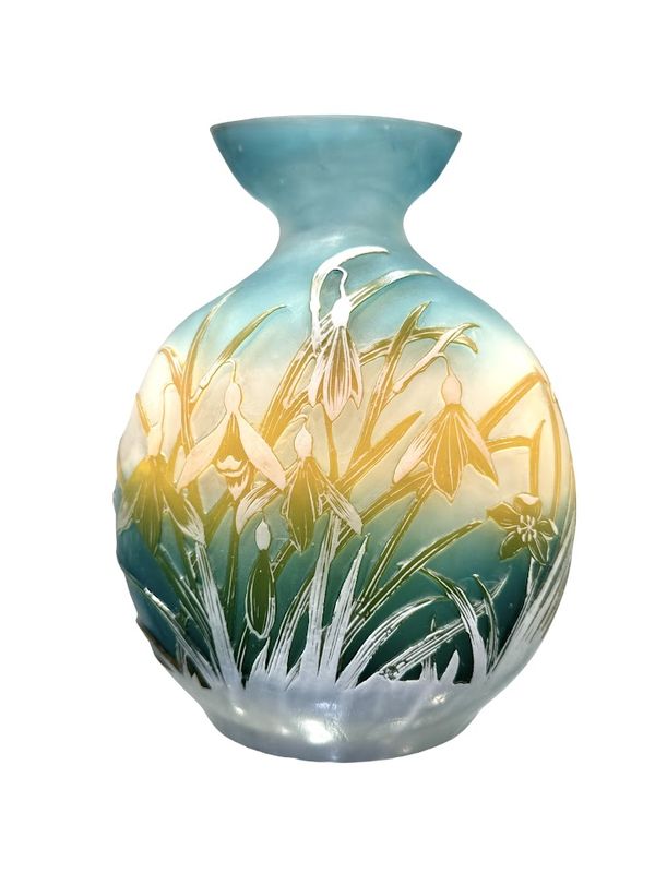 Décor finement gravé en camée à l'acide de fleurs de perce neige vertes, recouvertes de neige par la couche supérieur de verre blanc, le tout sur un fond satiné bleu azur et blanc illustrant le ciel d'hiver.