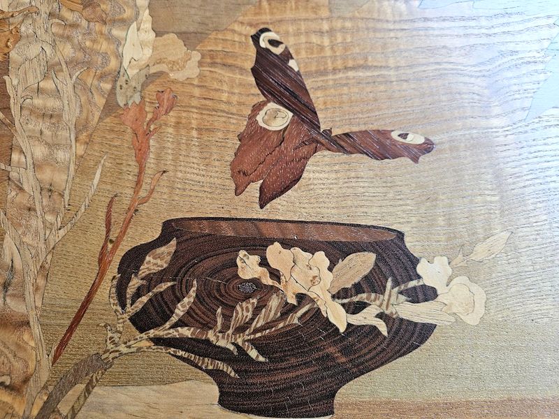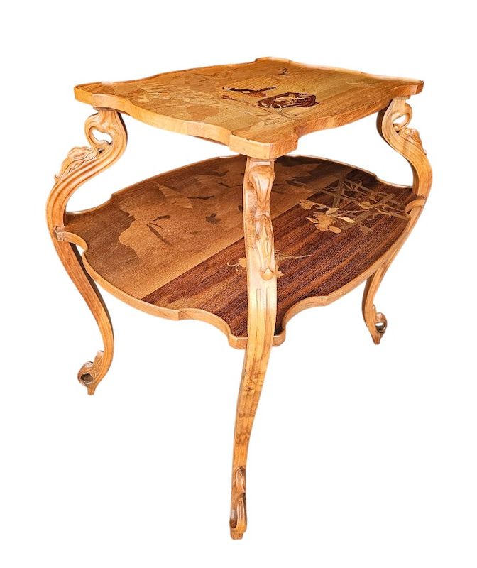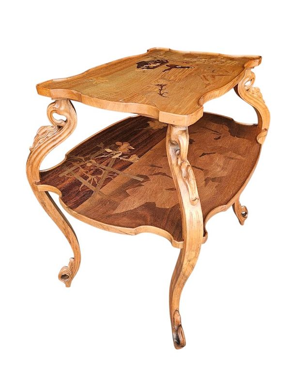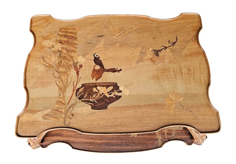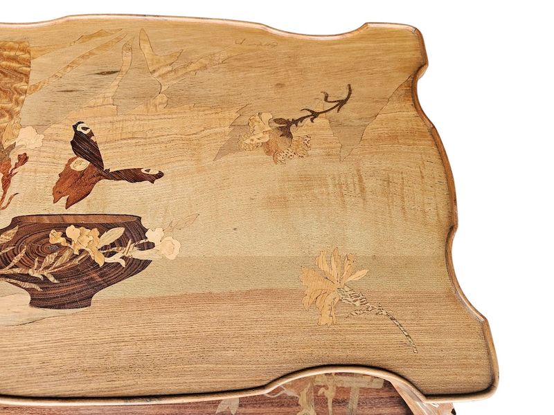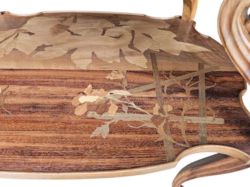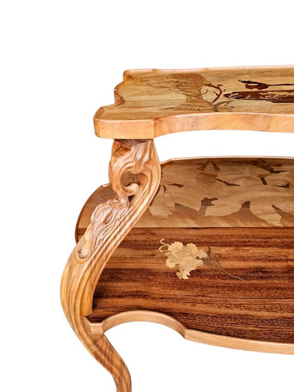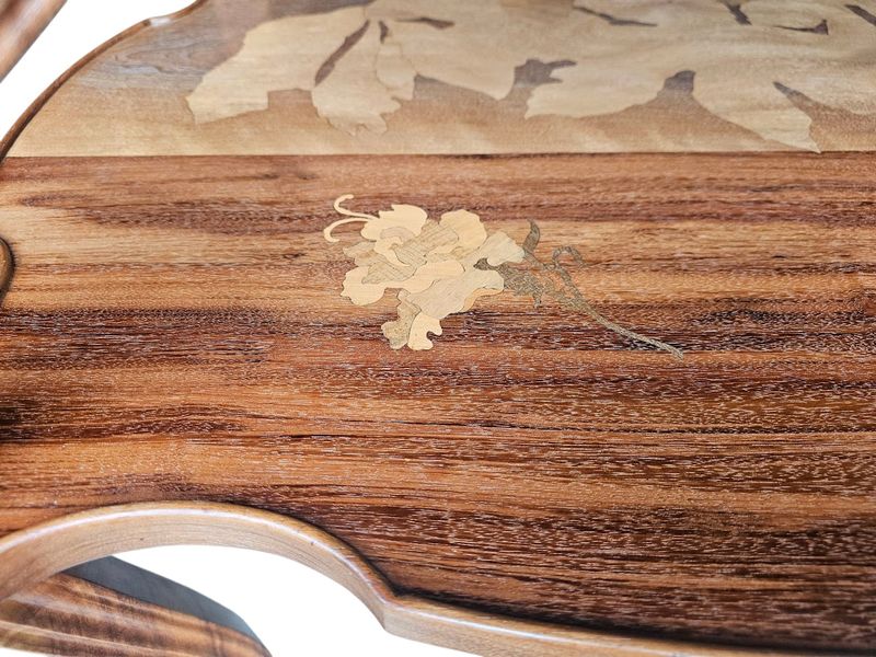 Elle présente deux plateaux à découpes chantournées munis d'alèses débordantes, le premier est marqueté de deux vases, d'un papillon et d'œillets, le second présente un décor d'iris et de feuillages. (Essences de frêne, noyer, palissandre, érable, tamo, poirier)