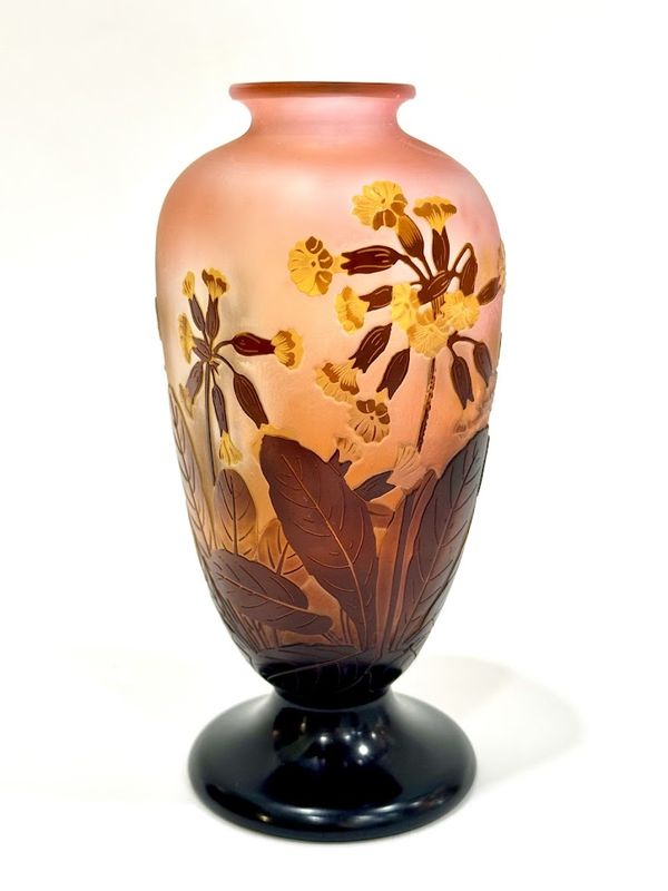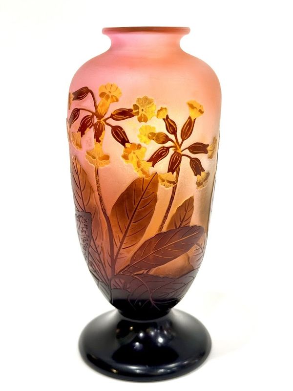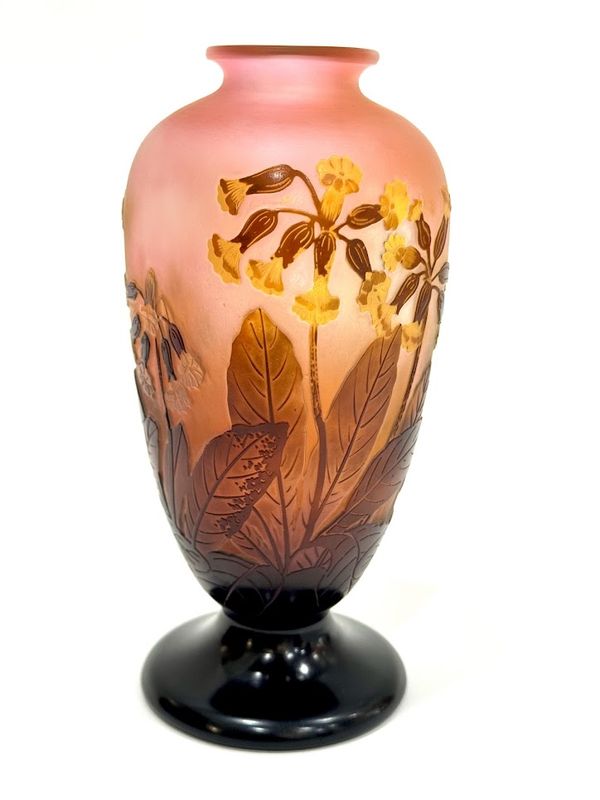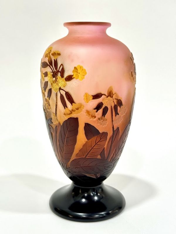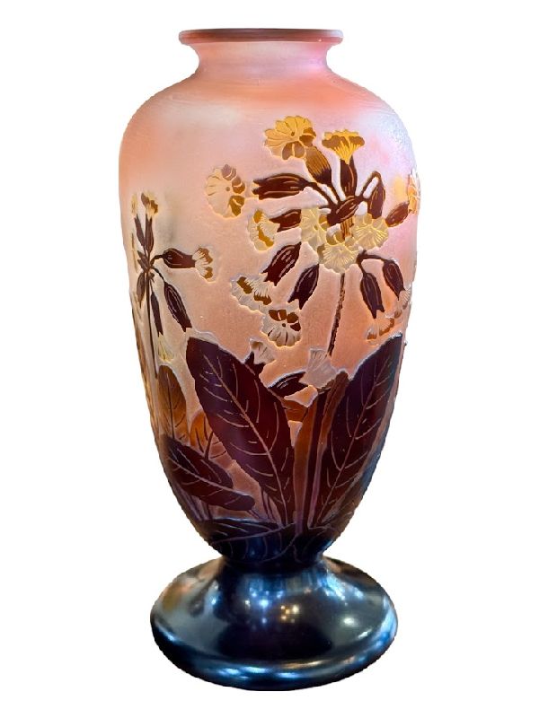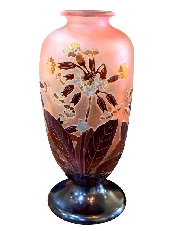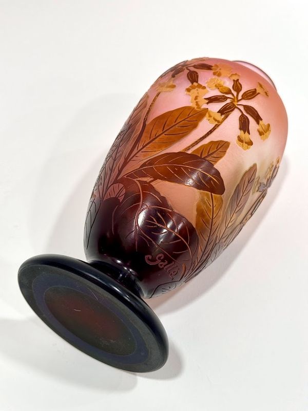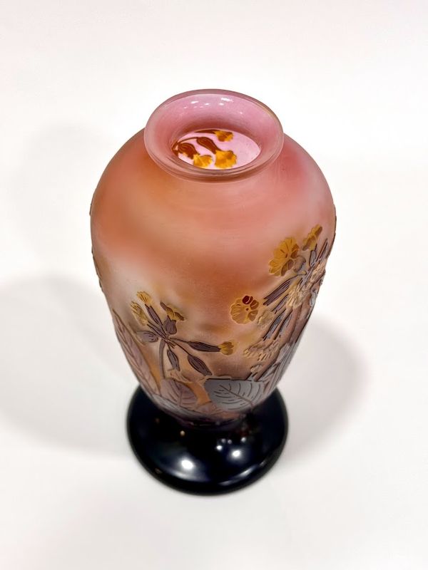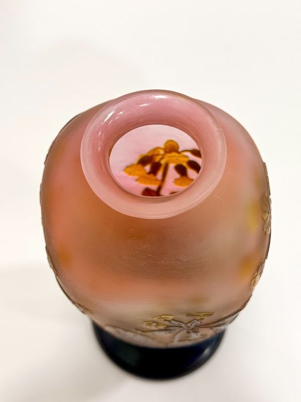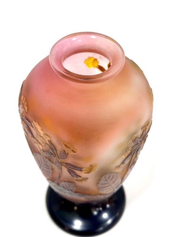 Rare décor gravé en fines réserves à l'acide de feuillages et de fleurs de coucous sur un fond rose satiné, à noter la précision de la gravure qui laisse apparaitre la couche de verre blanc intermédiaire uniquement sur les fleurs.