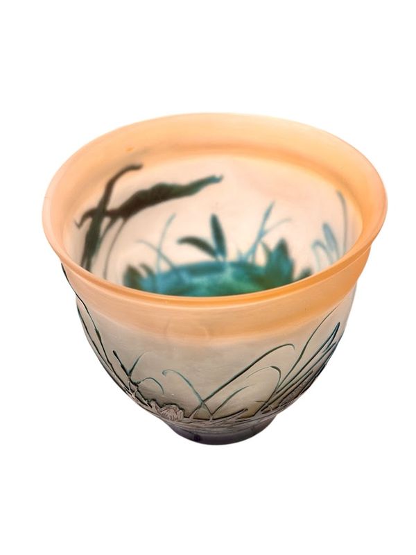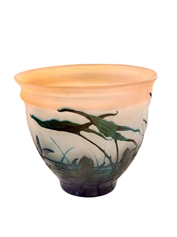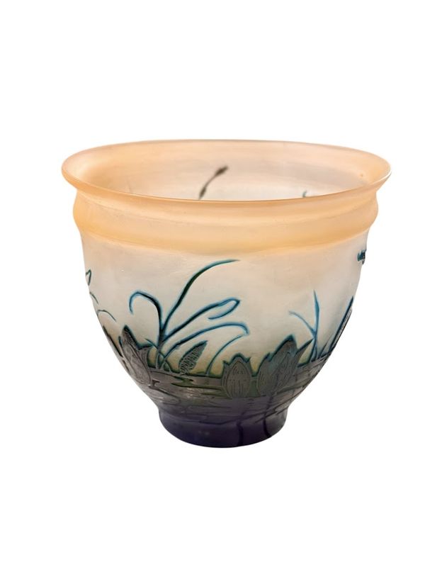 Vase de forme ovoïde et col arrondi , décor aquatique finement gravé en camée à l'acide de sagittaires et nénuphars, dans les tons de bleus et verts, sur un fond satiné rose-oranger et blanc. Beau rendu lumineux !