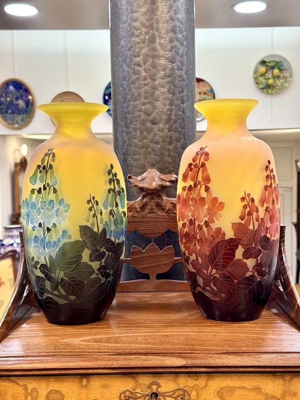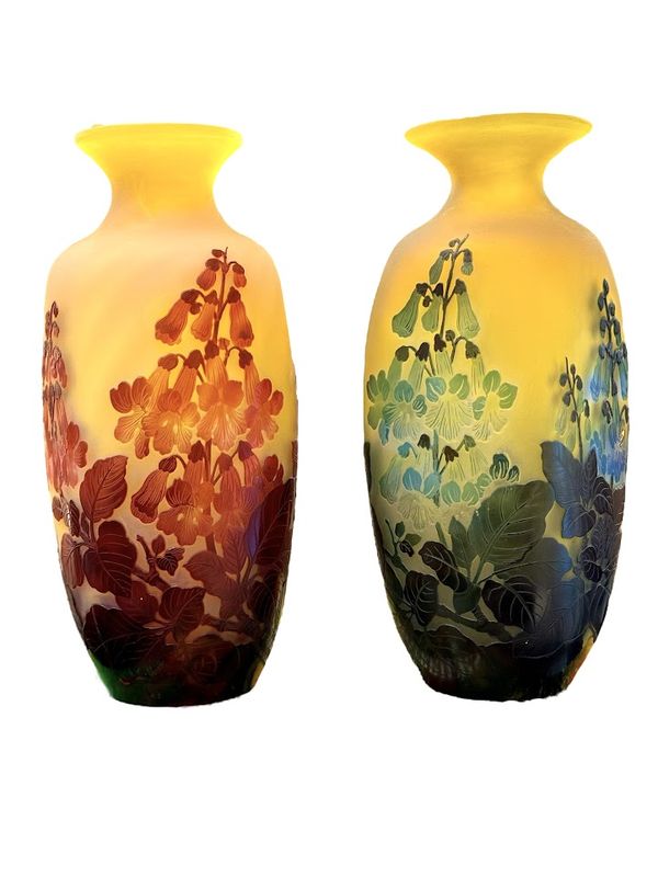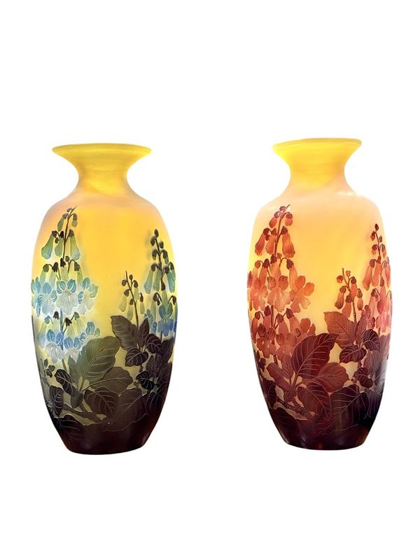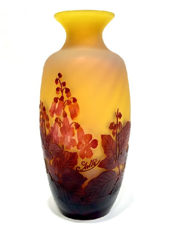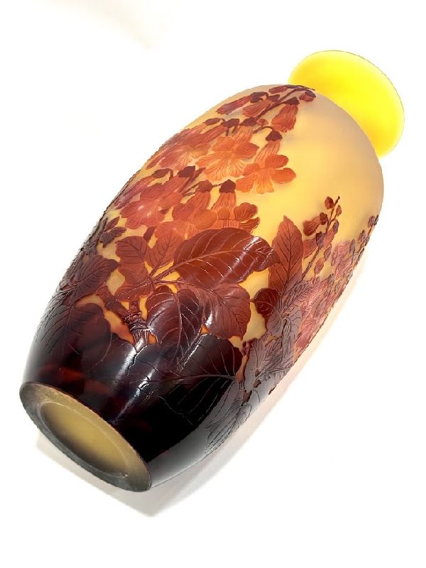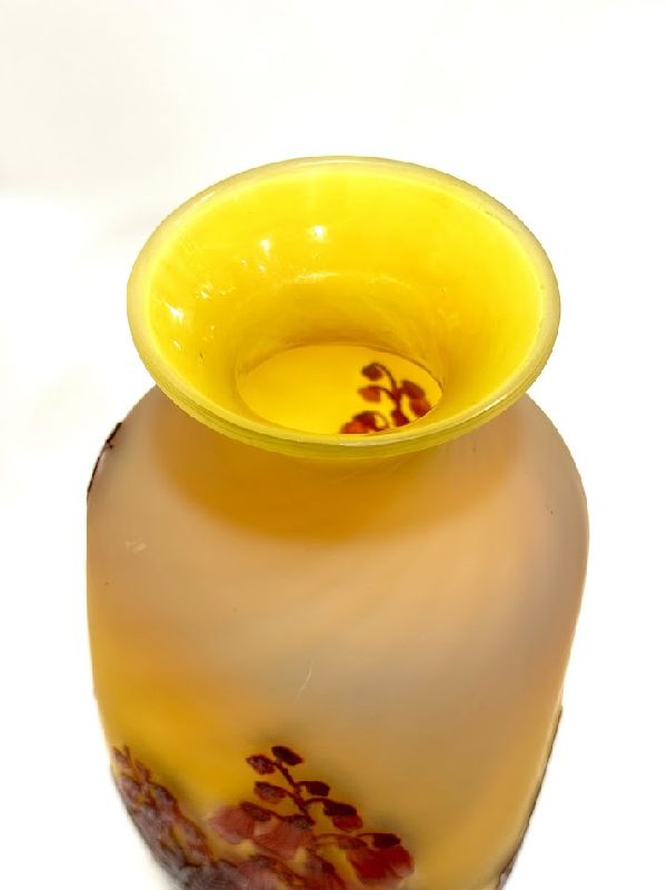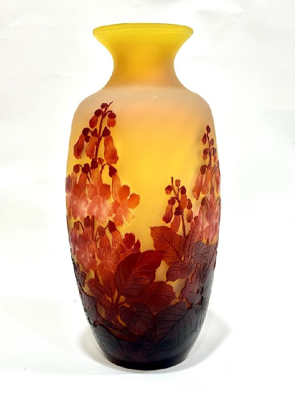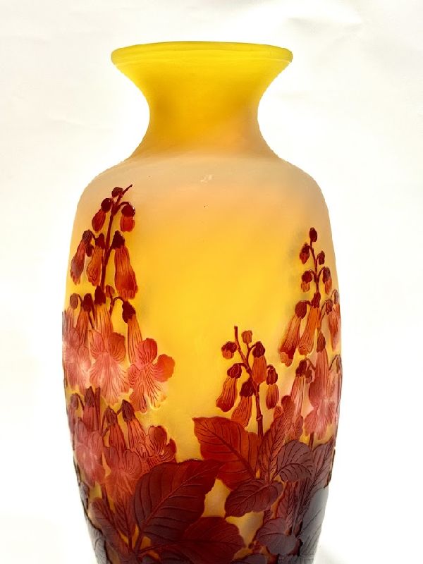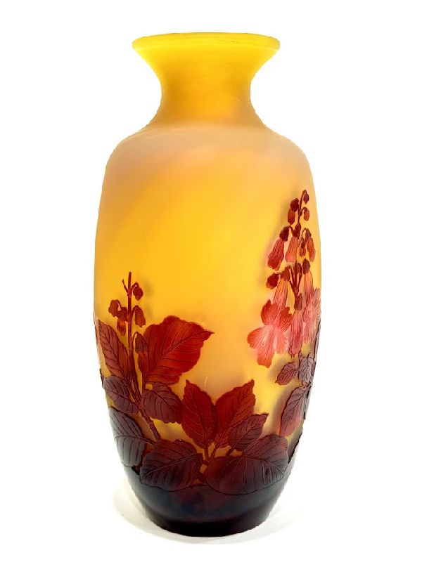 Vase en verre double de forme quadrangulaire à panse aplatie et col circulaire arrondi. Magnifique décor finement dégagé à l'acide de feuillages et de fleurs de digitales rouges, sur un fond satiné de jaune intense.