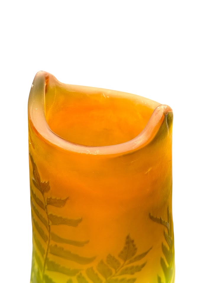 Emile Gallé Grand Vase “Fougère Scolopendre” nathalie rousselot2025-12-06T17:12:34+01:00 Description de l'objet strong> 7 5 décembre 2025 Verrerie Vase-Gallé-Fougère- Vase STYLE: Art nouveau ARTISTE: Etablissements Emile Gallé ANNÉE: 1907-1914 DIMENSIONS: H: 50.5 cm L: 23 cm P: 16 cm PRIX : 4500 Euros Plus d'information Haut vase ovoïde sur talon à col navette étiré et pincé en verre double. Décor gravé en fines réserves à l'acide de fougère verte sur un fond opacifié blanc et rose orangé. Mes Messages strong> Compétences: Art Nouveau Vase Gallé Fougères nathalie rousselotCréateur du site Partager Facebook Gazouillement LinkedIn Google + Email