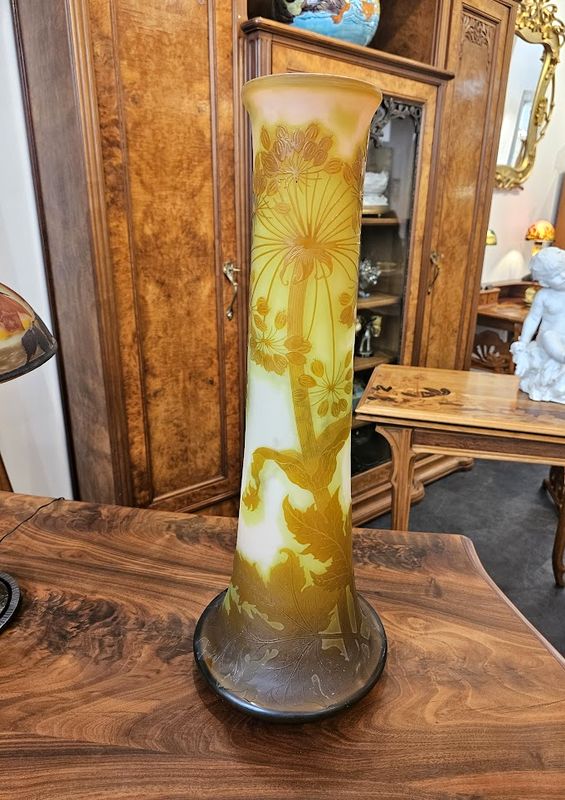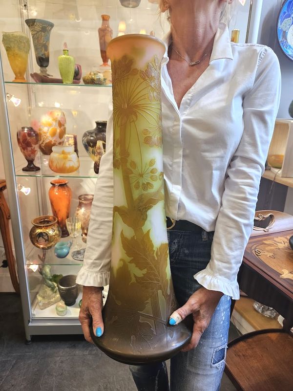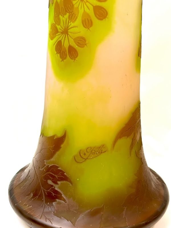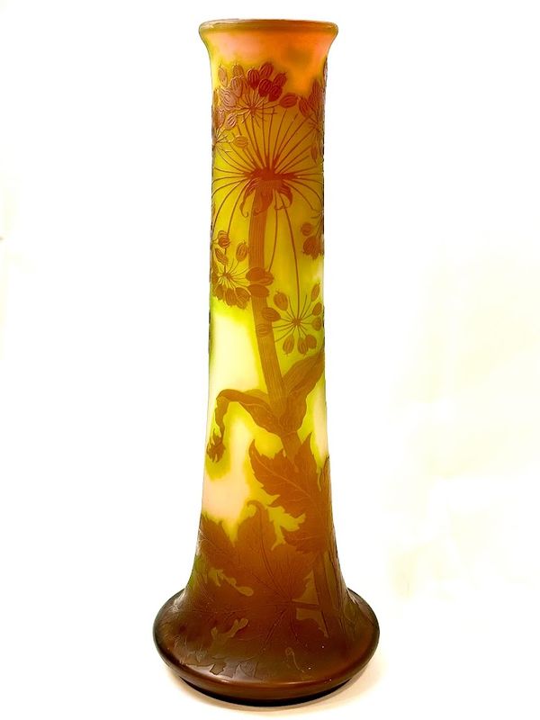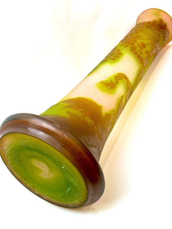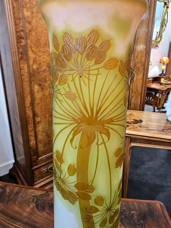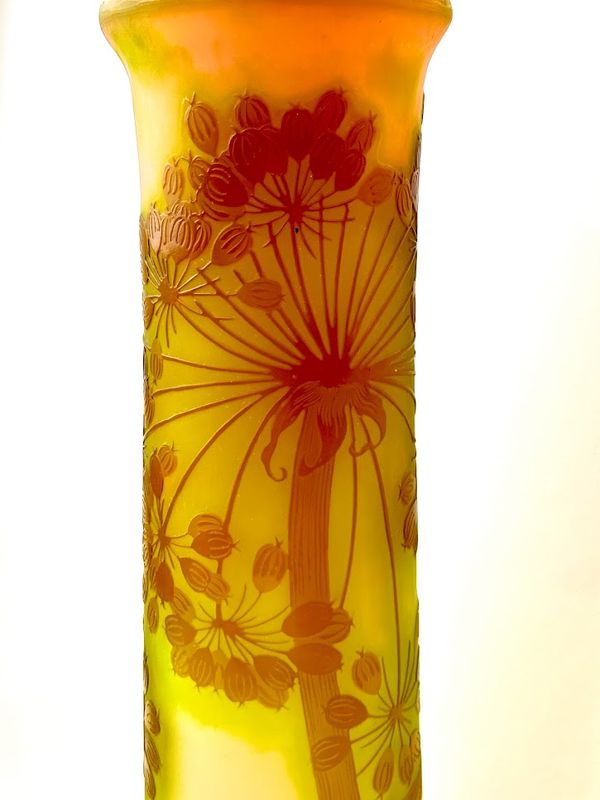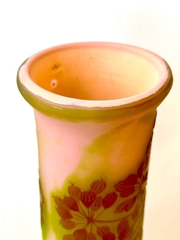 Important vase tubulaire à base circulaire en verre triple. Joli décor gravé en camée à l'acide de branches d'ombelles fleuries, sur un fond satiné de rose et vert. Signature à l'étoile sur la panse. Belle qualité de réalisation !
