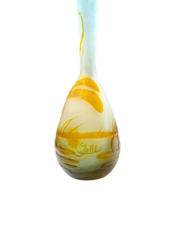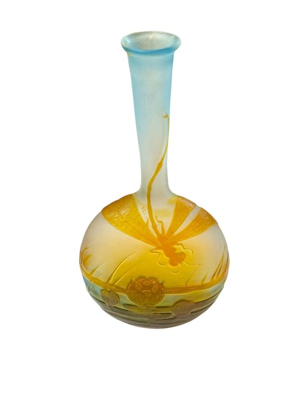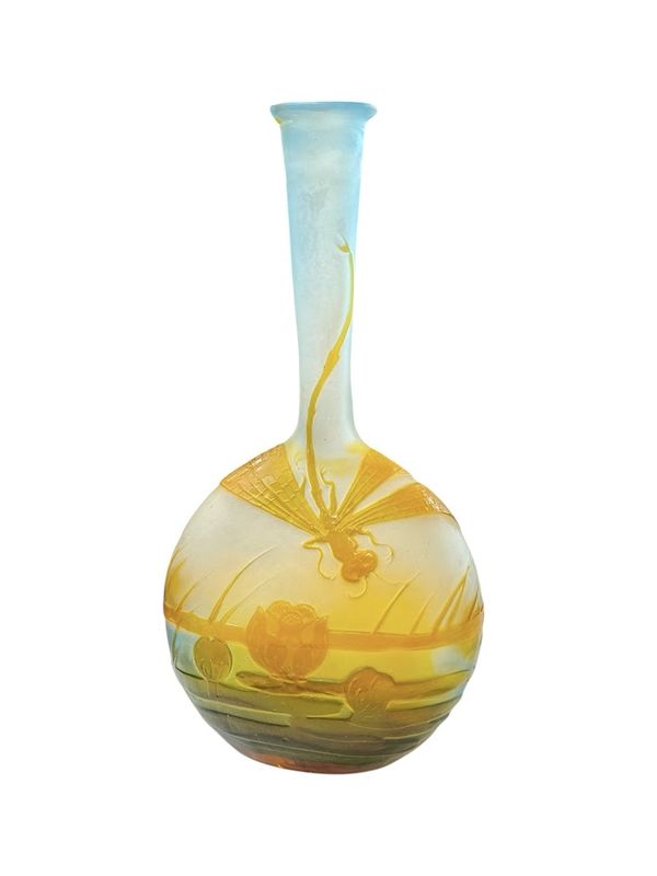 Décor aquatique finement gravé en camée à l'acide d'une libellule, survolant un marais fleuri de nénuphars dans des tons d'orange et bleu, sur un fond opacifié blanc et bleu translucide.