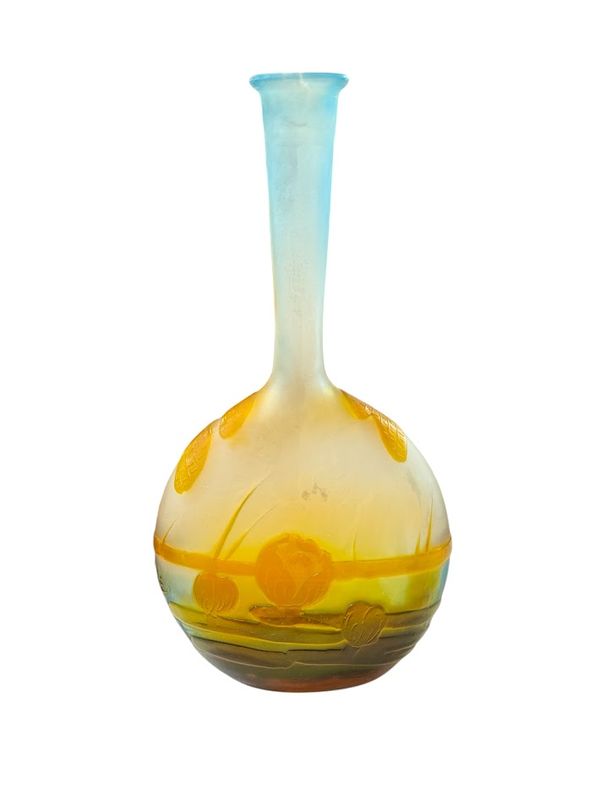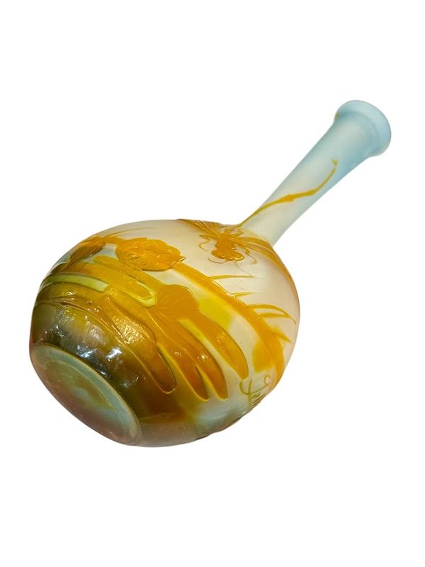 Joli vase soliflore en verre triple à base ovoïde méplate et long col épaulé.