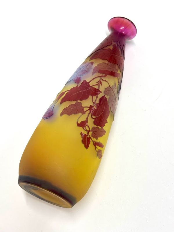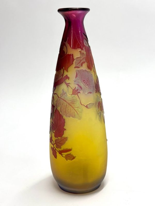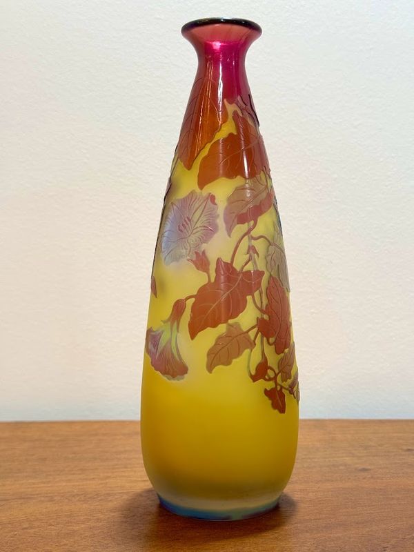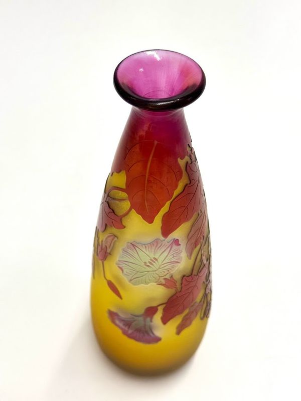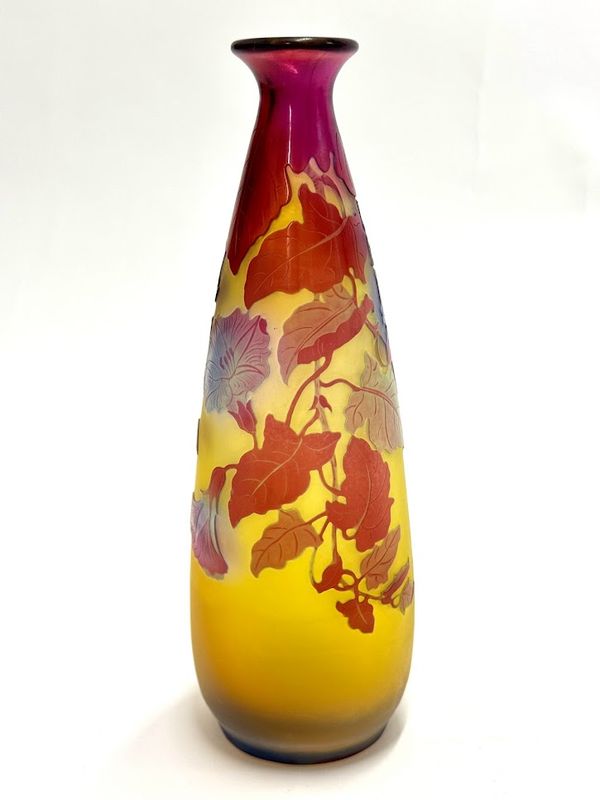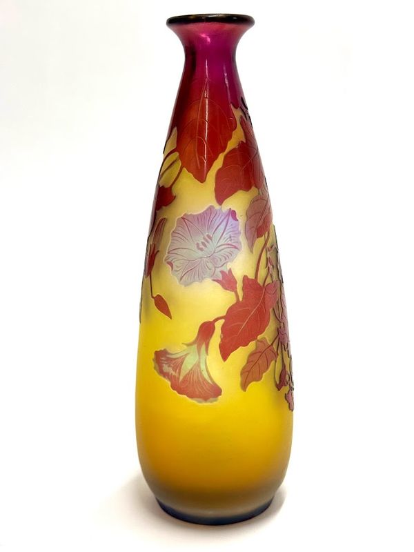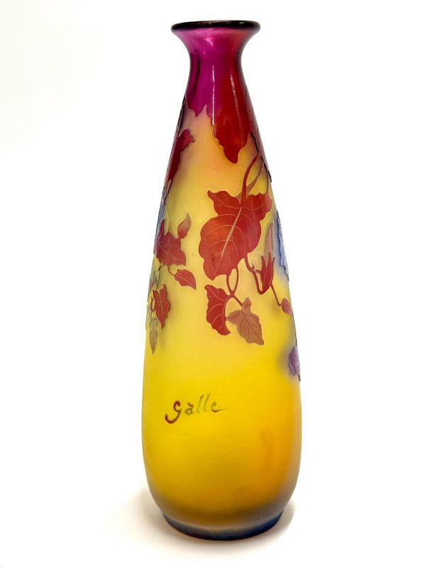 Joli décor gravé en camée à l'acide de volubilis bleue et mauve sur un fond jaune satiné.