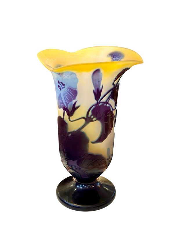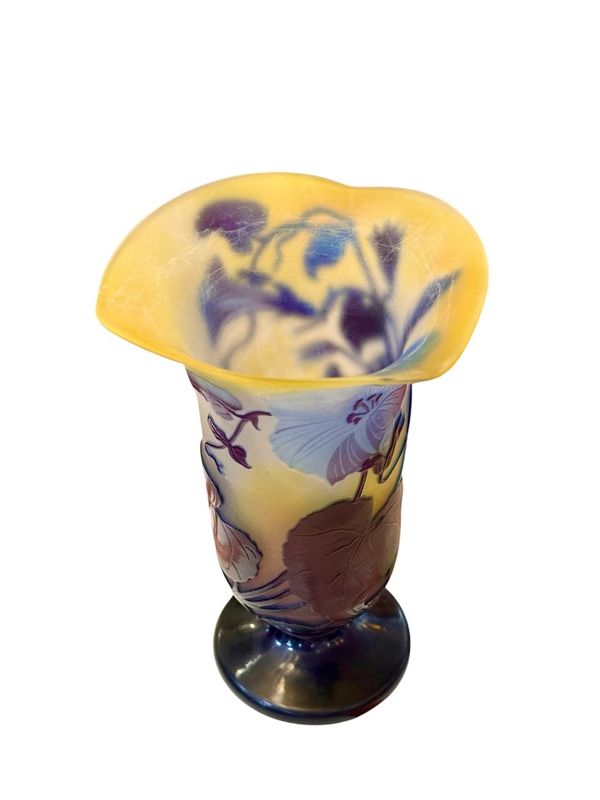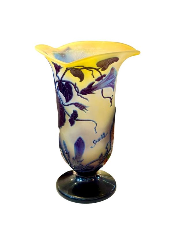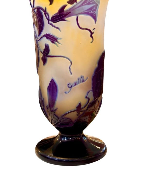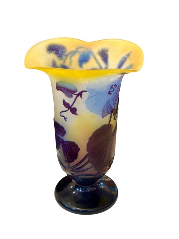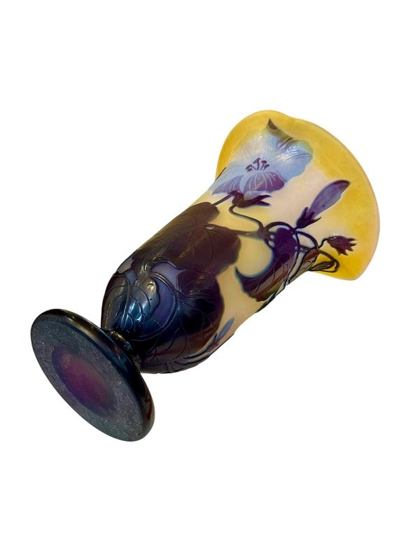 Emile Gallé Vase “Volubilis Bleues” nathalie rousselot2025-09-12T16:24:20+02:00 Description de l'objet strong> 9 12 septembre 2025 Verrerie Vase-Gallé-volubilis-Bleues- Vase STYLE: Art Nouveau ARTISTE: Etablissements Emile Gallé ANNÉE: 1918-1931 DIMENSIONS: H: 17 cm D: 10,5 cm PRIX : 3200 Euros Plus d'information Jolie vase balustre sur piédouche à col en corolle en verre triple. Décor gravé en profondes réserves à l'acide de feuillages et de fleurs de volubilis bleues, sur un fond satiné de jaune et blanc. Beau rendu lumineux ! Mes Messages strong> Compétences: Art Nouveau Vase Gallé "Aux Volubilis" nathalie rousselotCréateur du site Partager Facebook Gazouillement LinkedIn Google + Email
