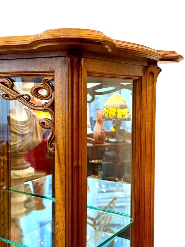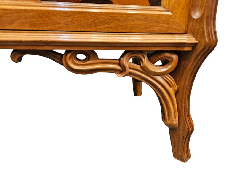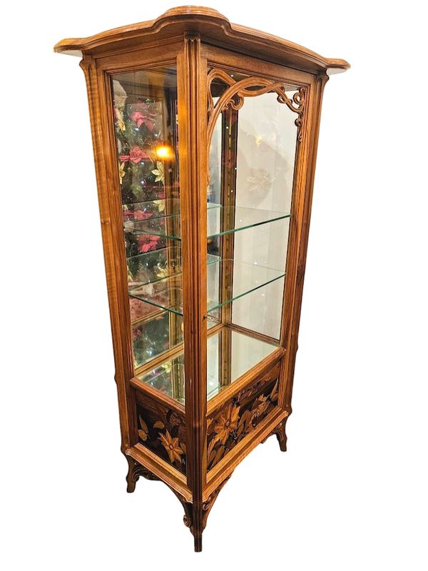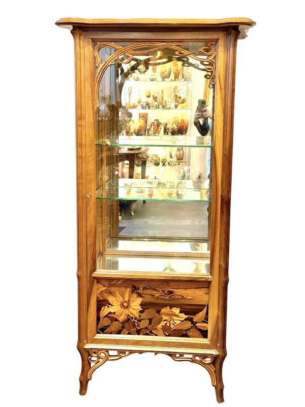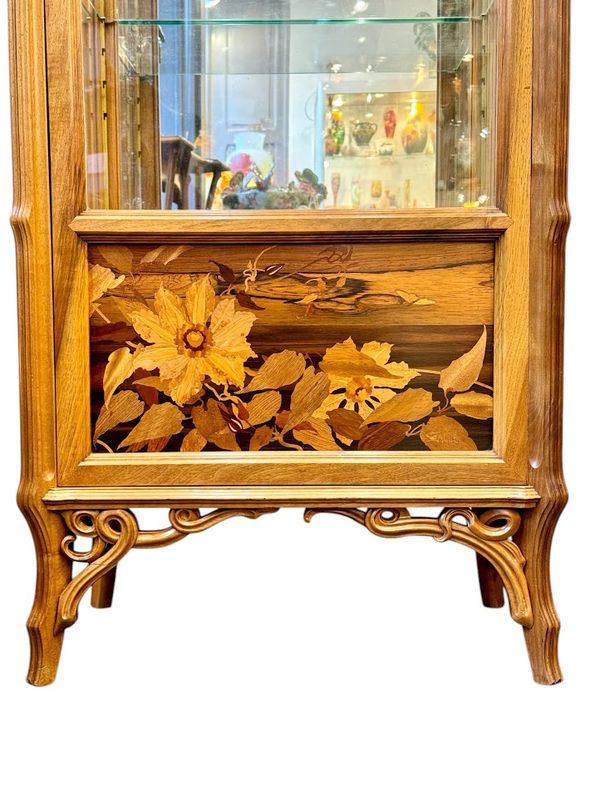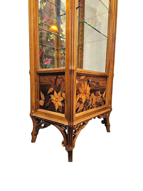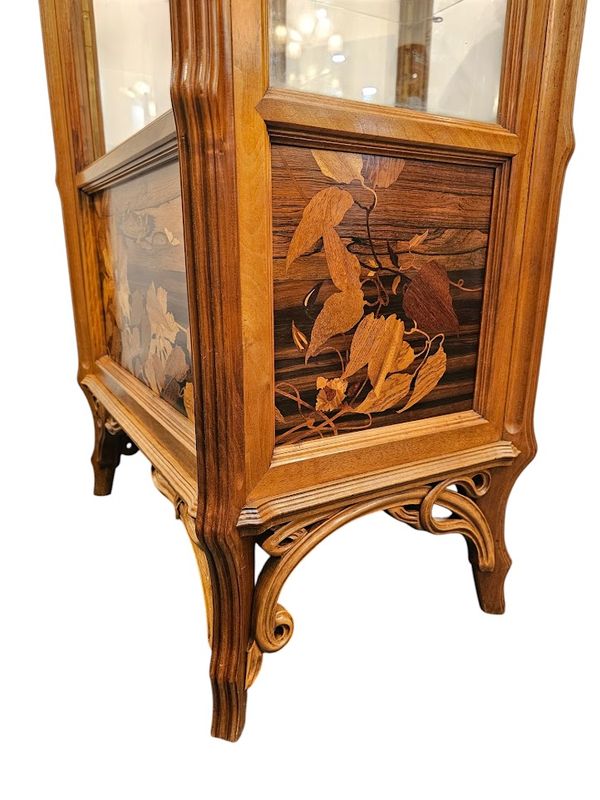 Superbe vitrine en noyer massif mouluré et sculpté à riche décor marqueté de clématites.