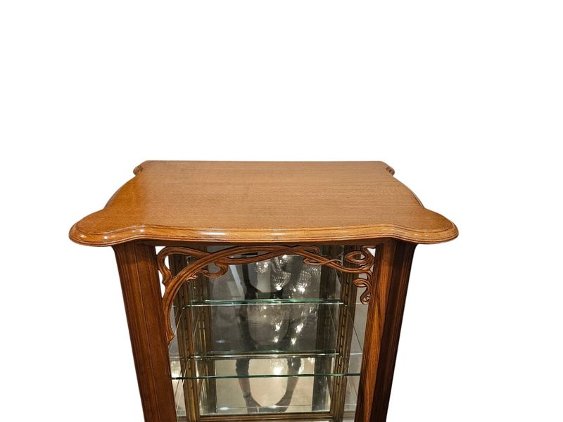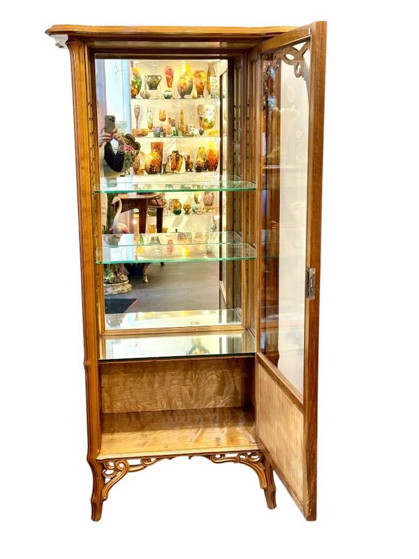 Elle ouvre par une porte vitrée, panneautée et parée d'une traverse ajourée, elle présente des montants angulaires à découpes chantournées, le piétement est relié par des traverses ajourées et sculptées de tiges ligneuses.