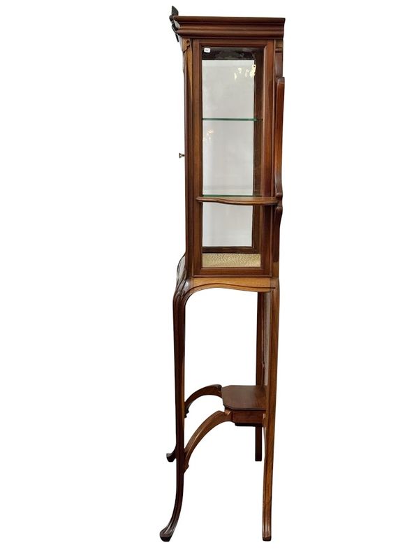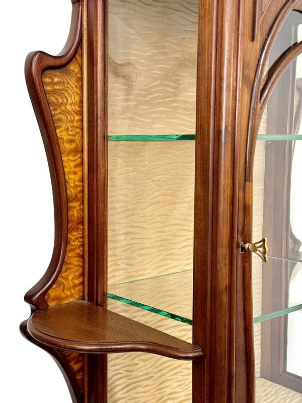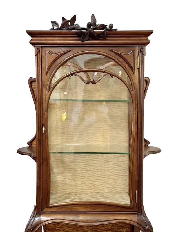 Elle présente un caisson réhaussé de feuillages sculptés ouvrant par une porte vitrée sur deux étagères en verre, elle est parée de panneaux à découpes chantournées et de deux étagères, elle repose sur un piétement galbé présentant une console d'entretoise soutenue par des montants arqués.
