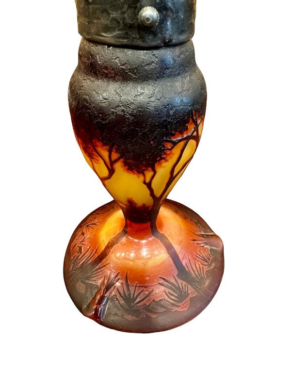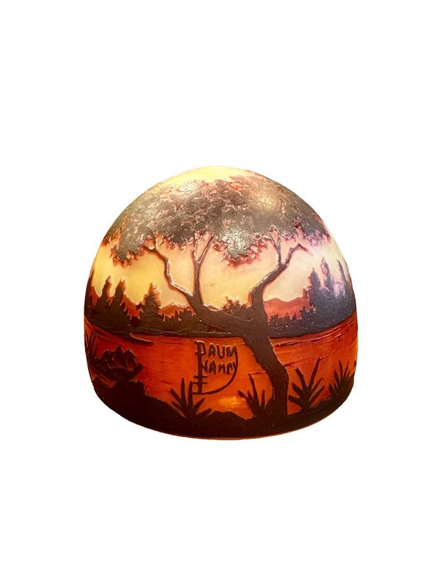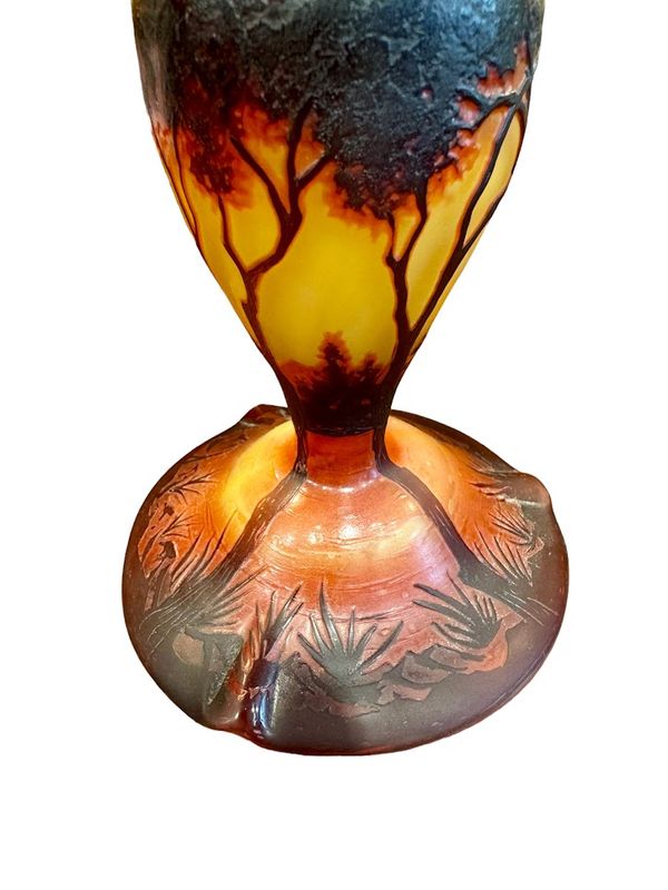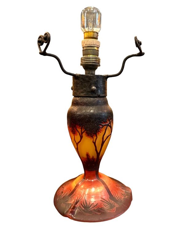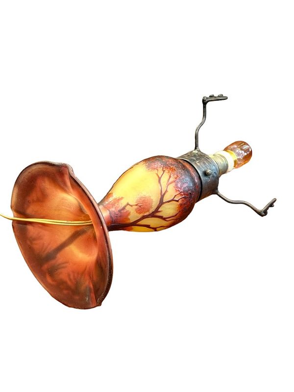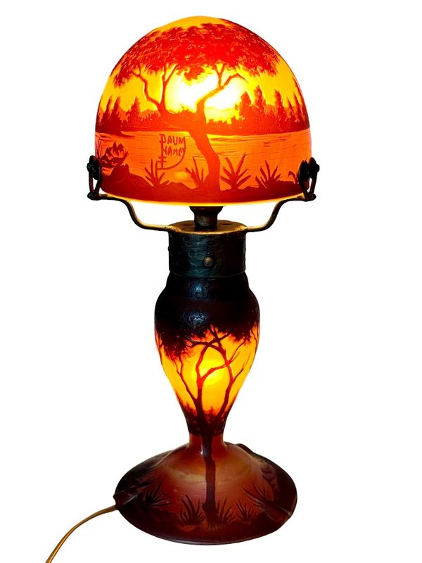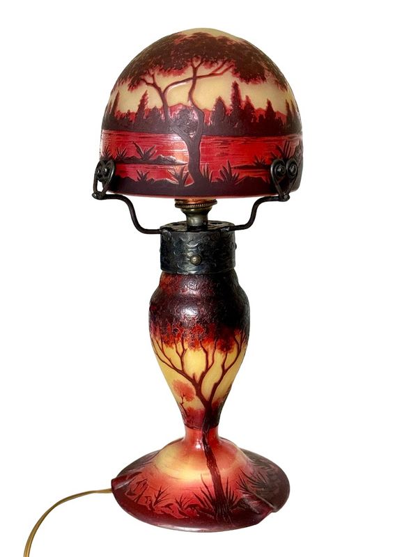 Petite lampe champignon en verre double, à décor finement gravé en camée à l'acide d'un paysage Lacustre dans les tons de bordeaux sur un fond marmoréen orangé et jaune.