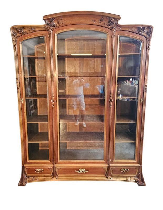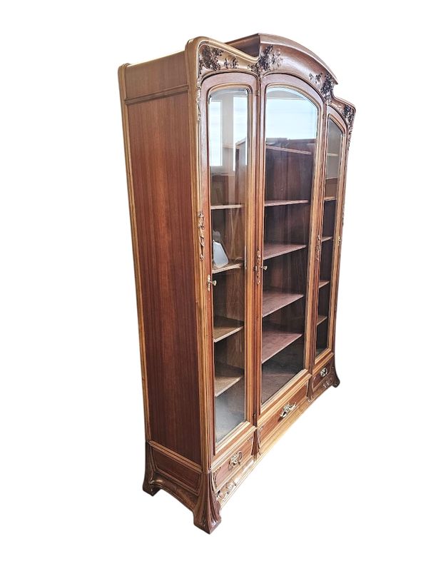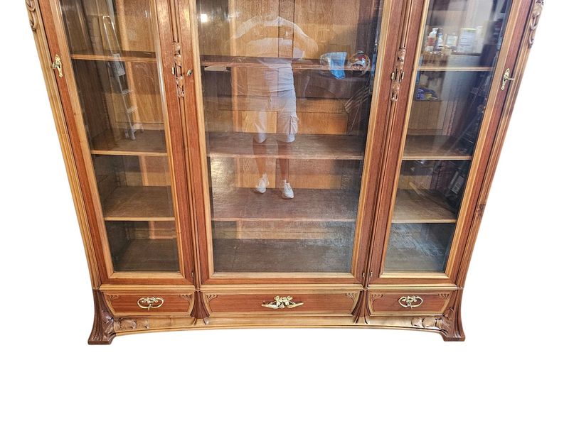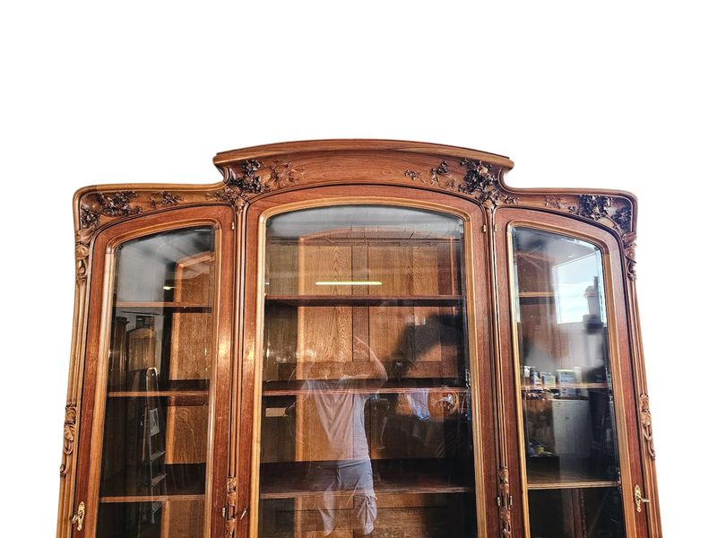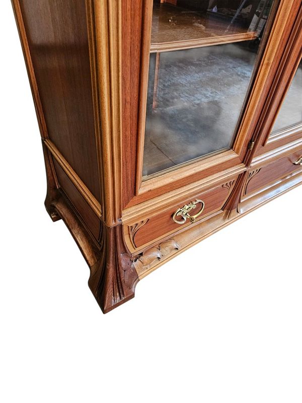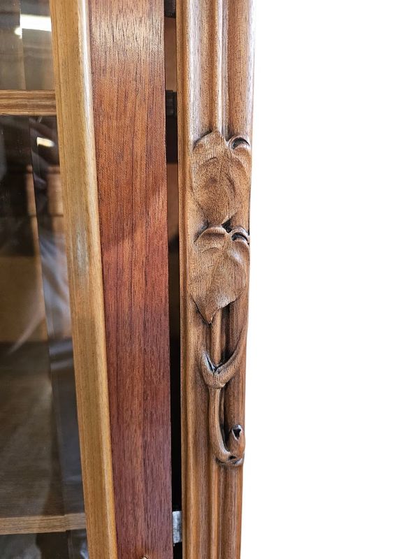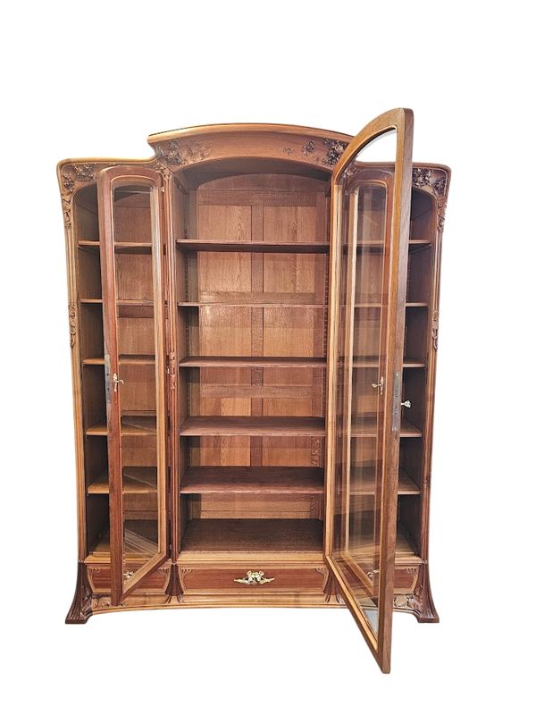 Superbe bibliothèque en noyer massif et placage de palissandre, moulurée et sculptée à décor de lilas.