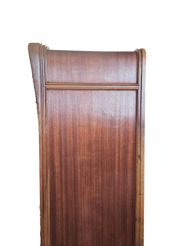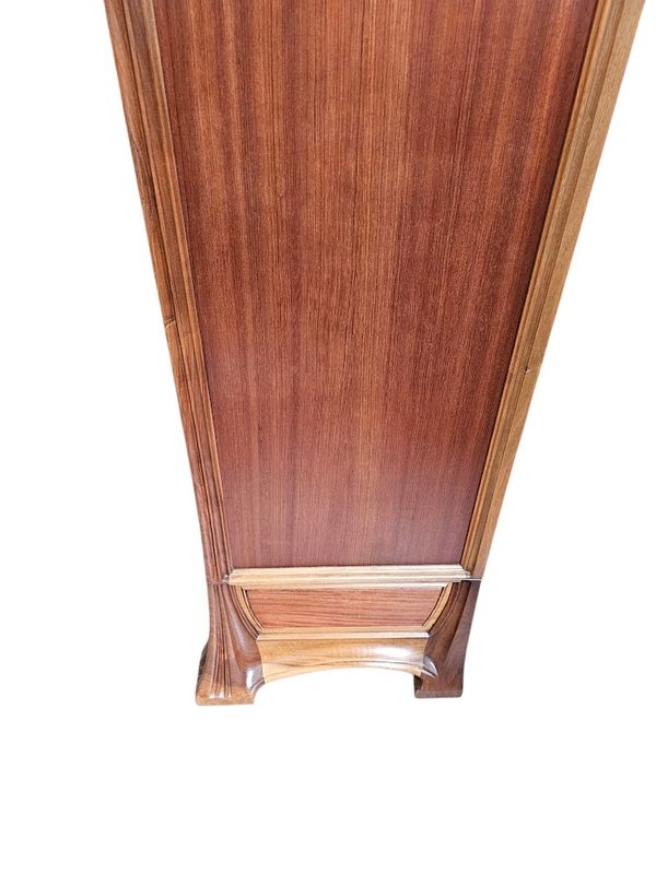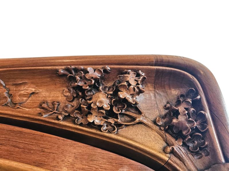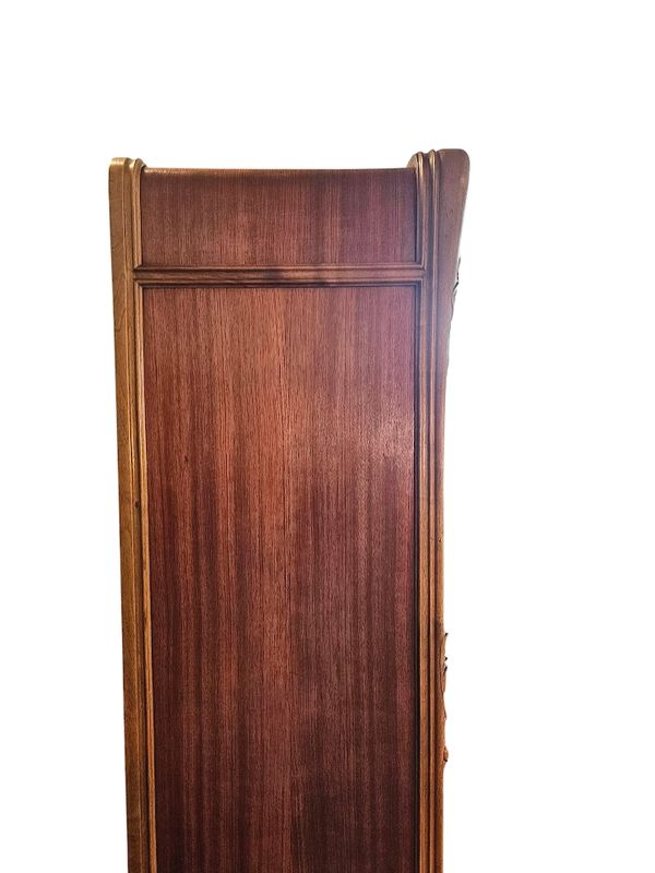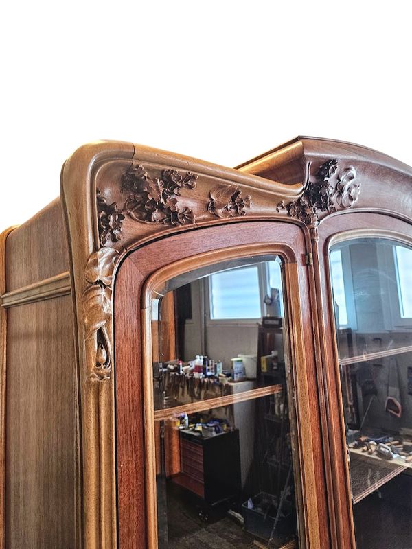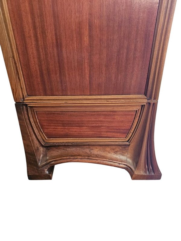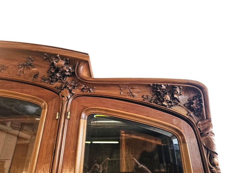Superbe bibliothèque en noyer massif et placage de palissandre, moulurée et sculptée à décor de lilas.