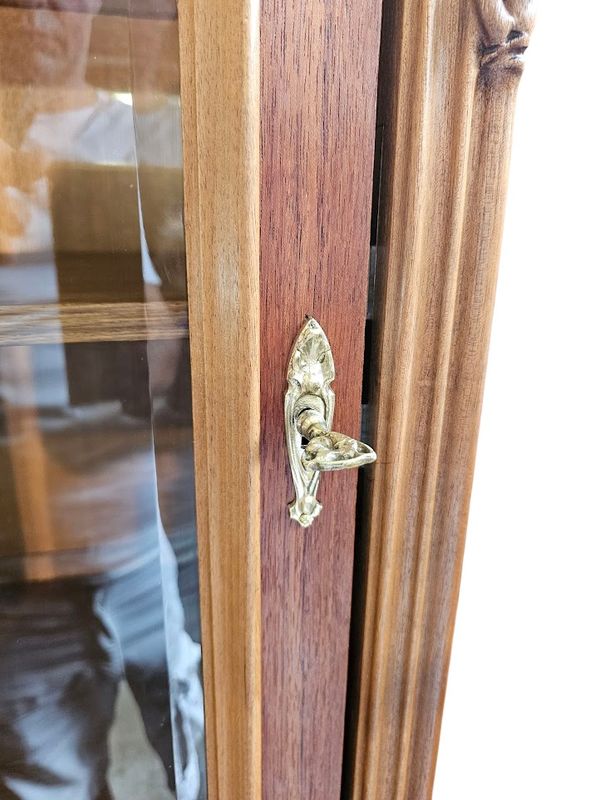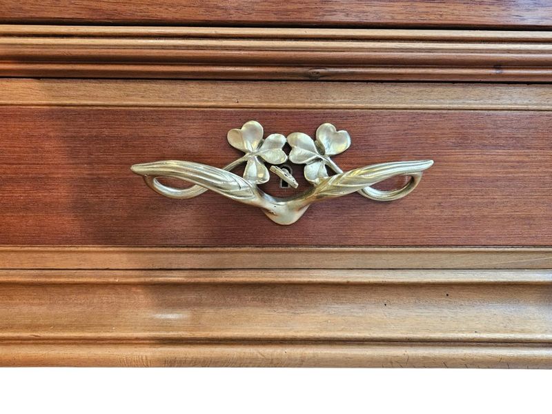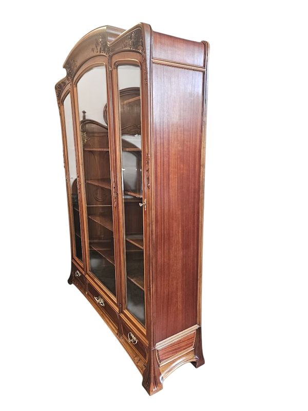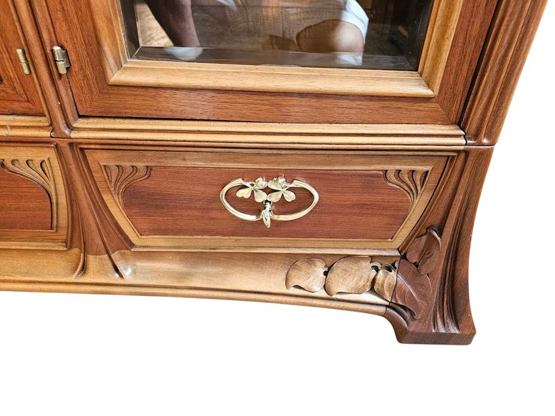 Les tiroirs présentent d'importantes poignées en bronze doré, les vitres sont biseautées, les rayonnages modulables en hauteur.
