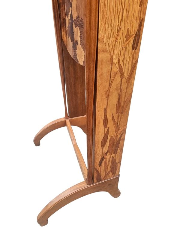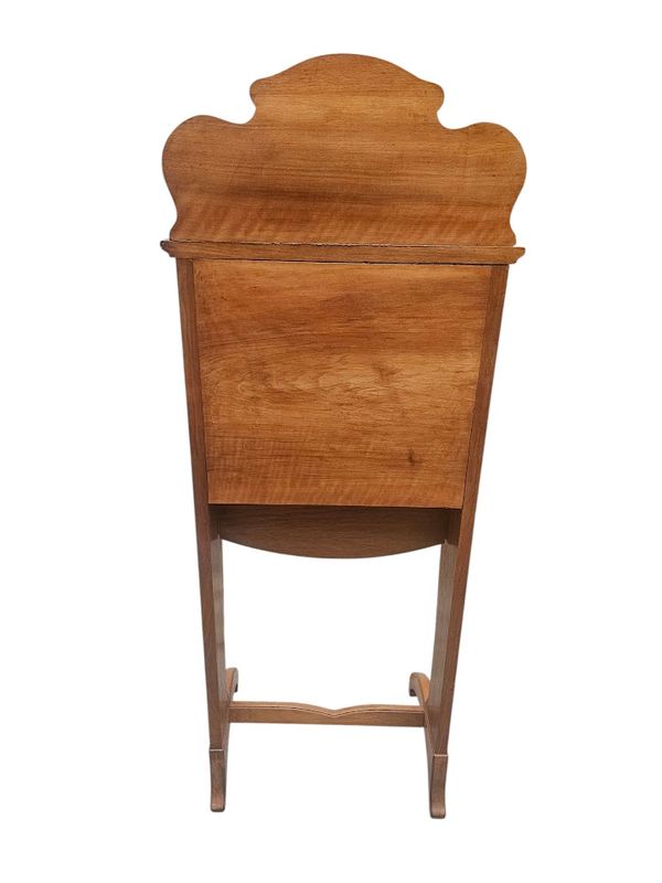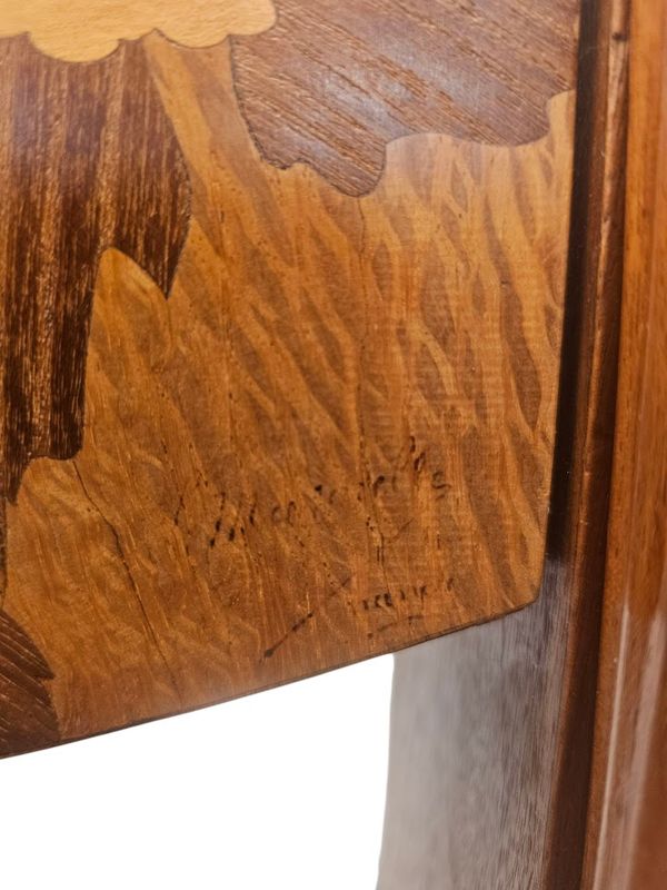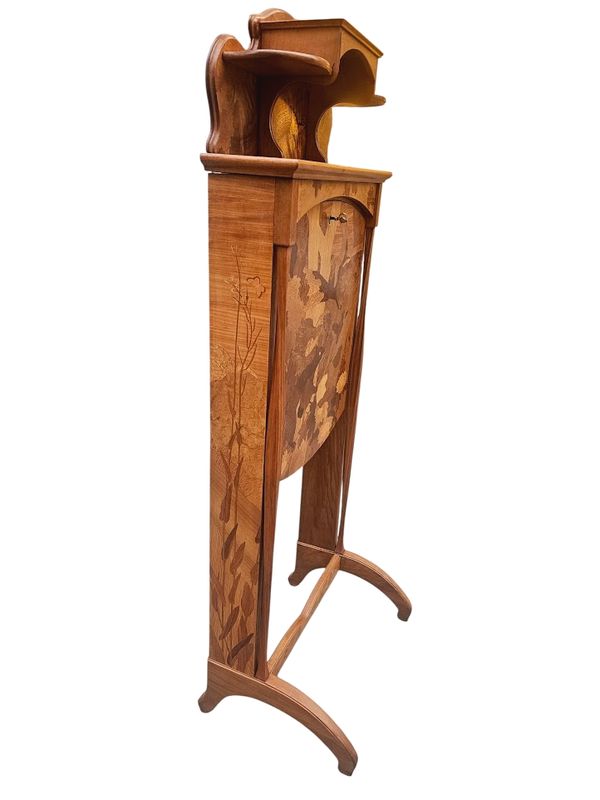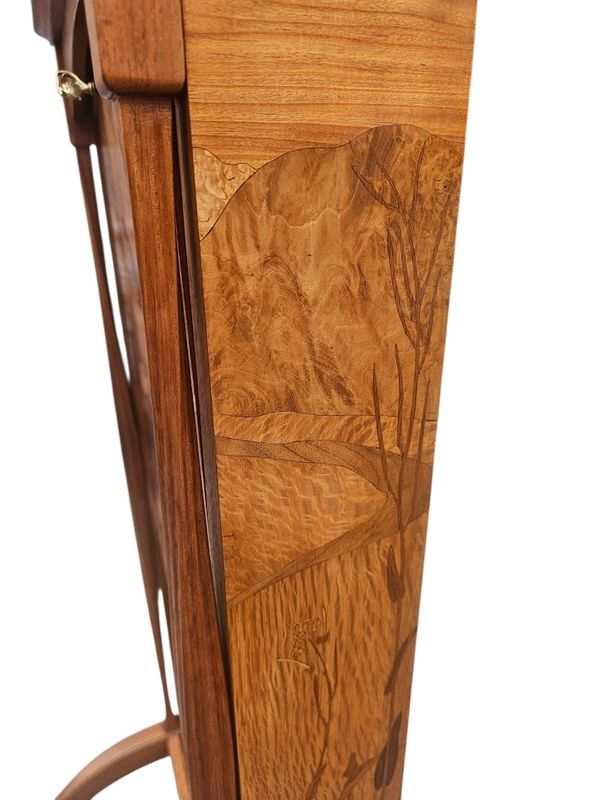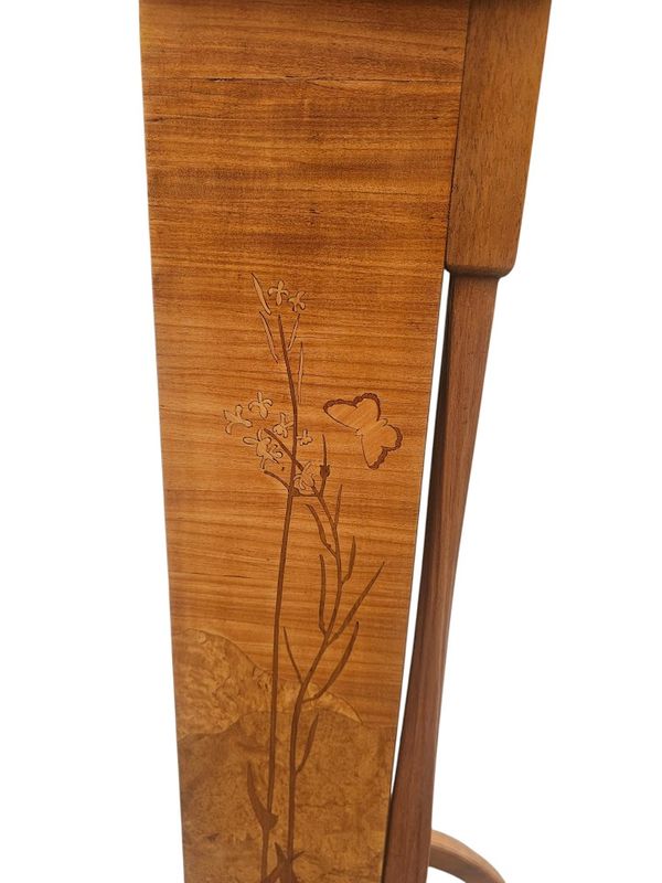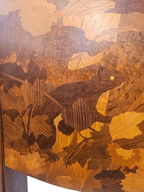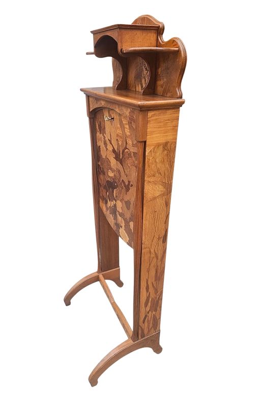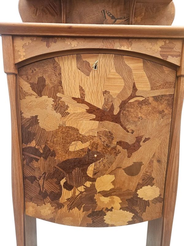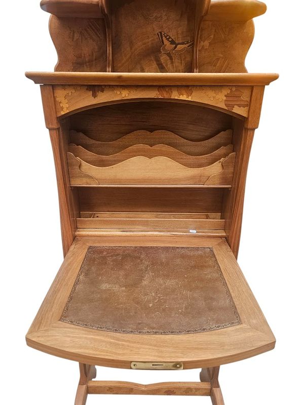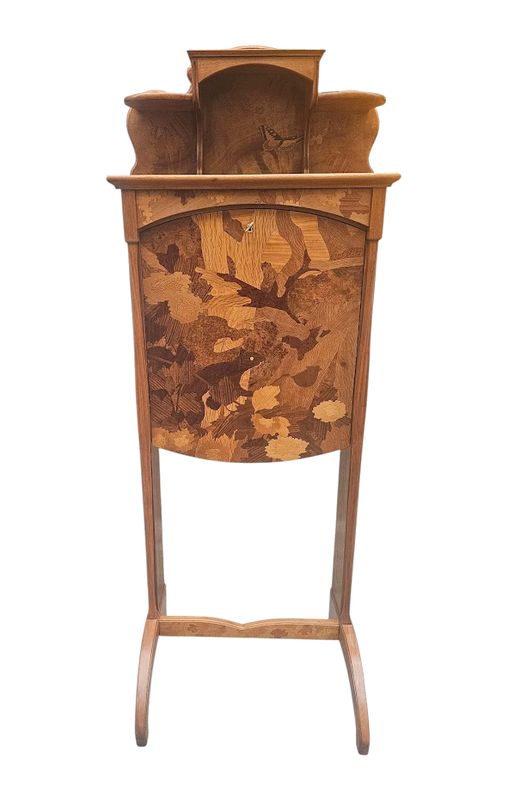 La partie haute présente une niche à entablement et fond marqueté de papillons, le caisson ouvre par un abattant au décor d'un écureuil branché sur un intérieur compartimenté et muni d'un porte-plumes, les cotés sont décorés d'un paysage fleuri.