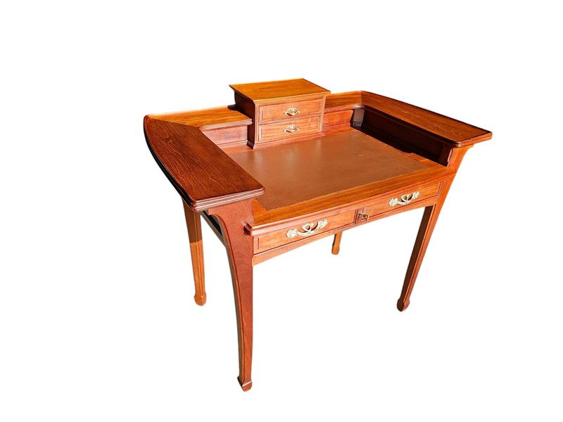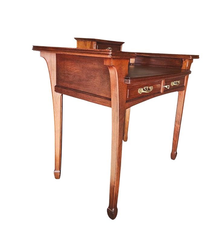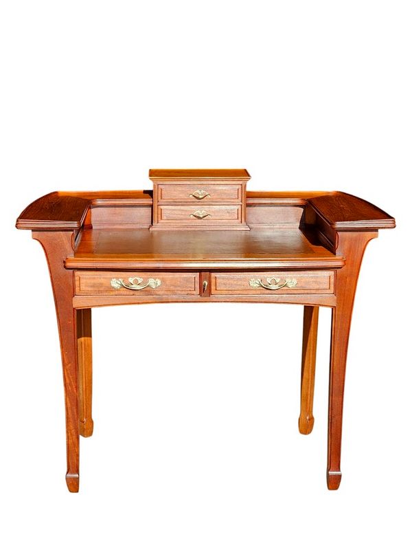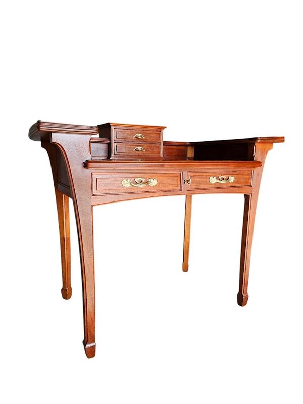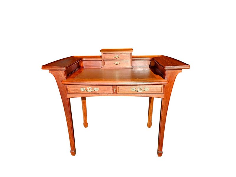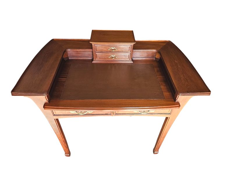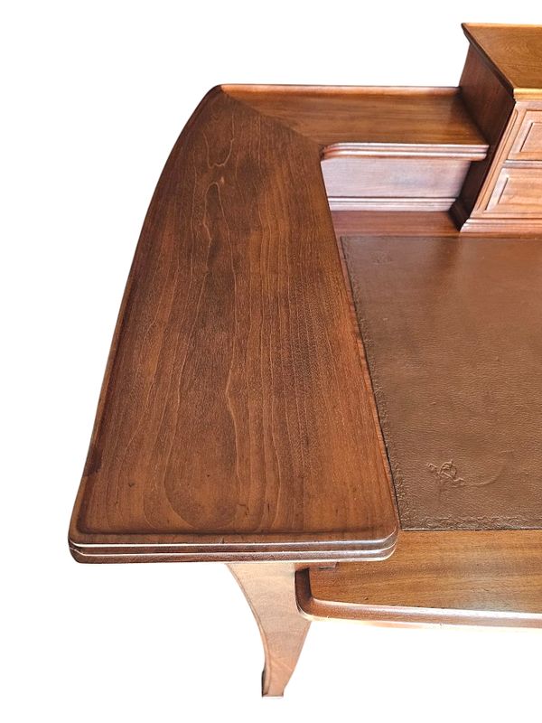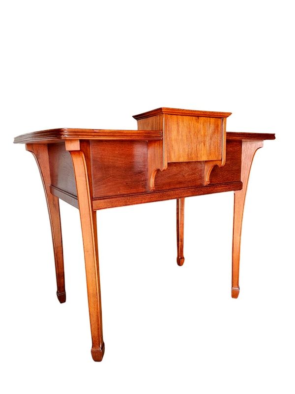 Il présente un gradin réhaussé de tablettes incurvées, entrecoupé par un caisson débordant ouvrant par deux tiroir, il repose sur un piétement galbé et ouvre en ceinture par deux tiroirs.