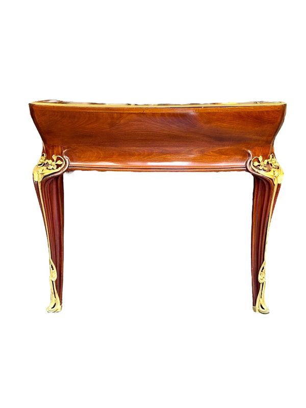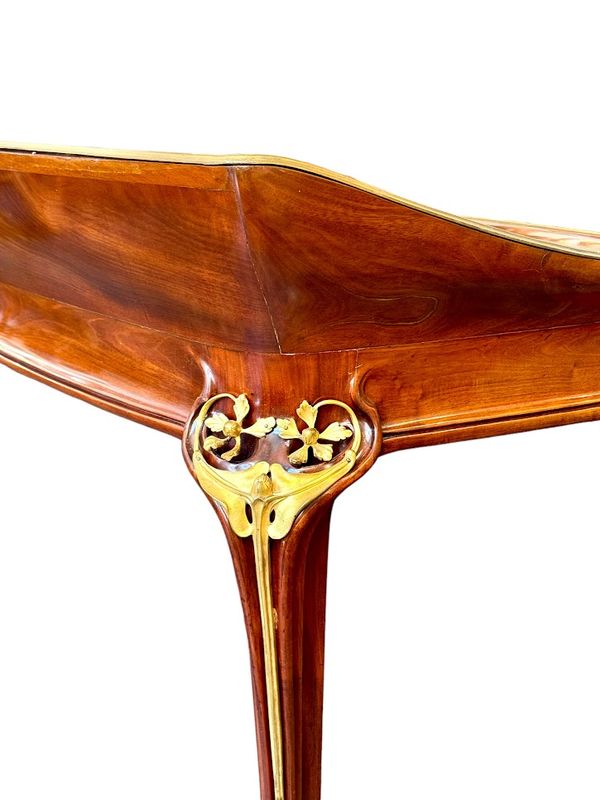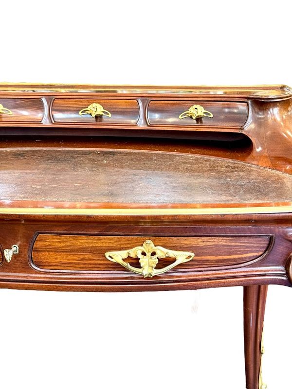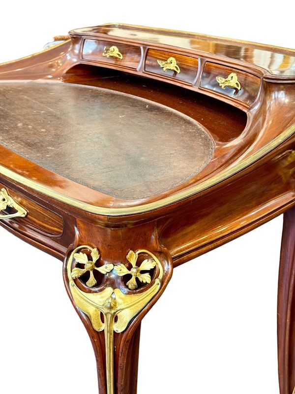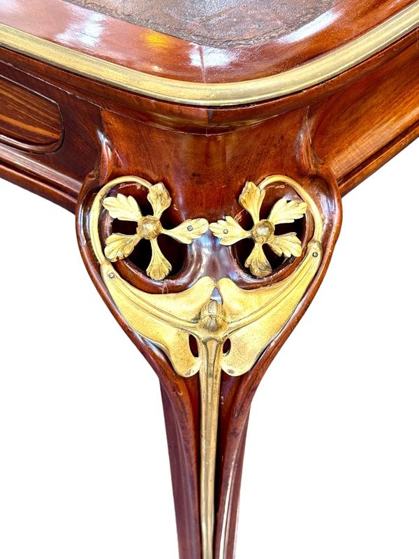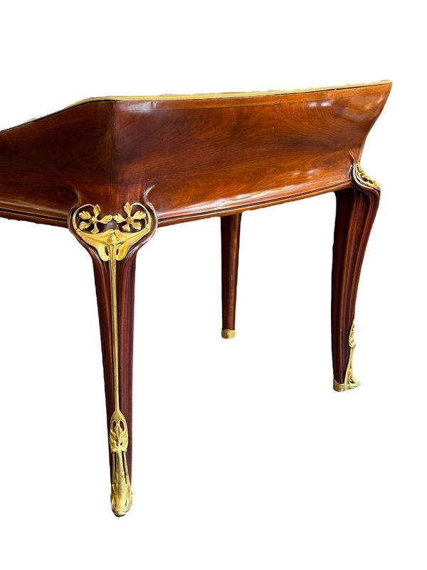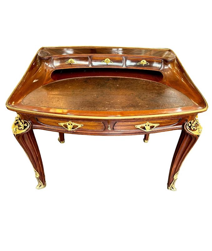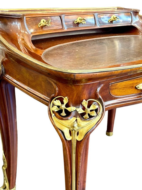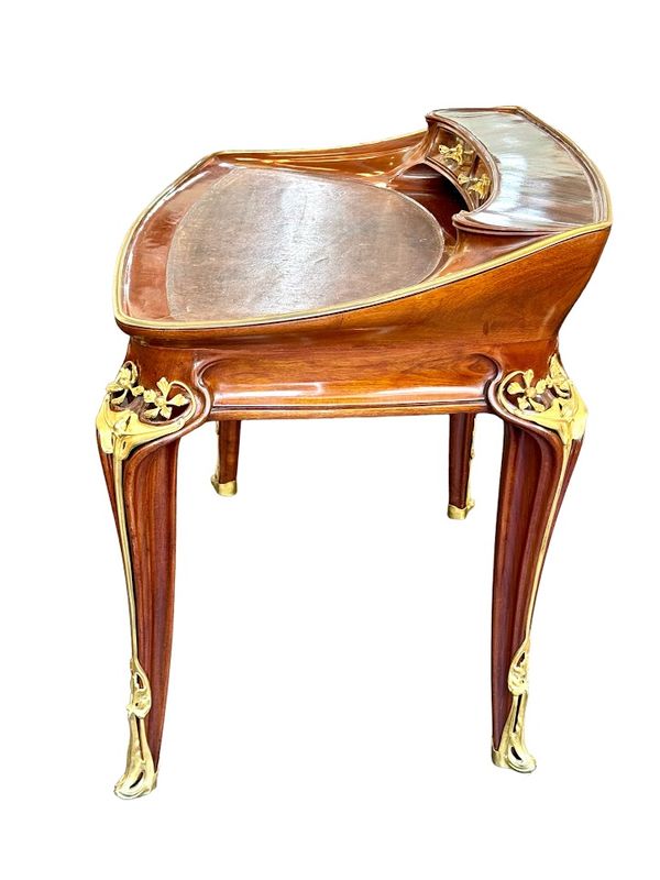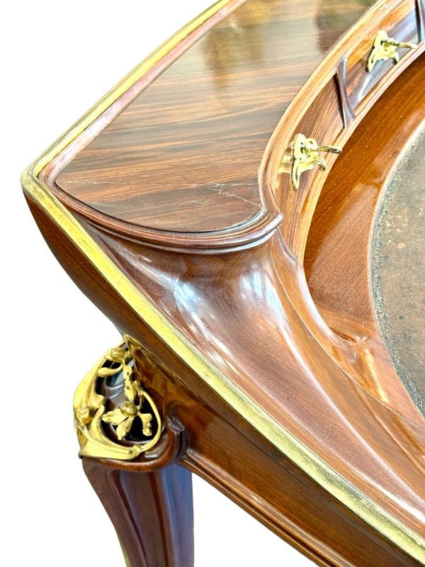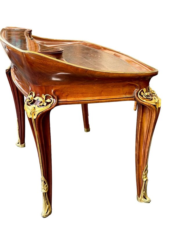Exceptionnel bureau en acajou massif et placage de courbaril mouluré, ajouré et sculpté. Il présente un gradin galbé ouvrant par trois tiroirs, un plateau paré d'une lingotière aux cotés concaves et arrondis, gainé de son  écritoire en cuir brun,  il ouvre par deux tiroirs en ceinture. Il repose sur quatre pieds angulaires courbés, nervurés et ajourés, doublés de feuillages et de fleurs en bronze doré tout comme les poignées de tirage. Le mobilier aux orchidées, comme le mobilier aux nénuphars, était conçu et exécuté pour des clients prestigieux, chaque meuble était fabriqué à la commande et diffusé en petite série de quatre ou cinq exemplaires maximum, notre exemplaire illustre le talent technique et artistique de Louis Majorelle. Qualité muséale!