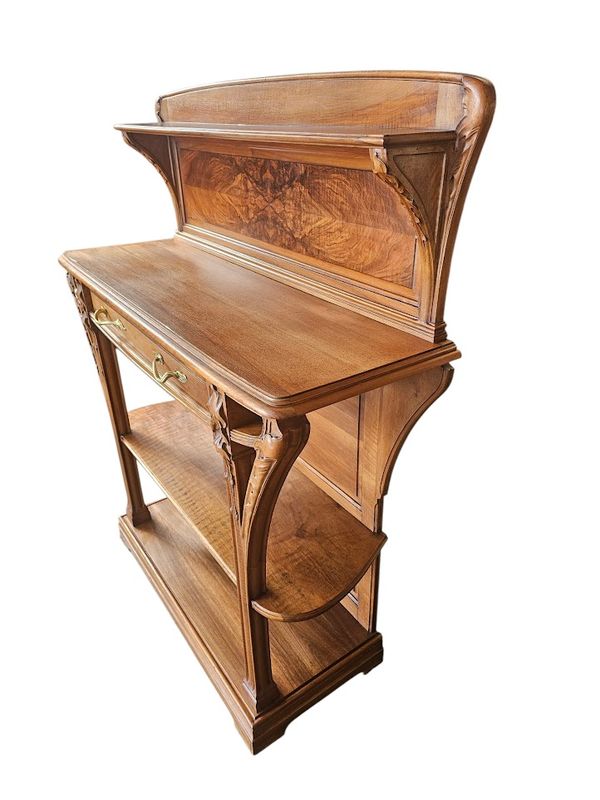 Desserte en noyer et placage de noyer, ouvrant par un tiroir en ceinture surmontant un plateau d'entretoise débordant aux cotés arrondis.