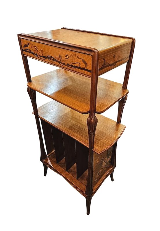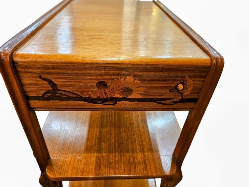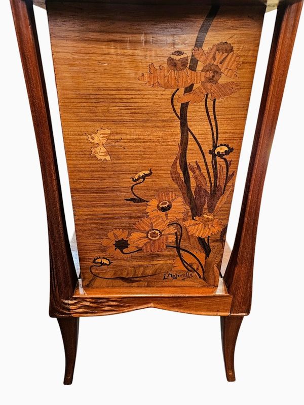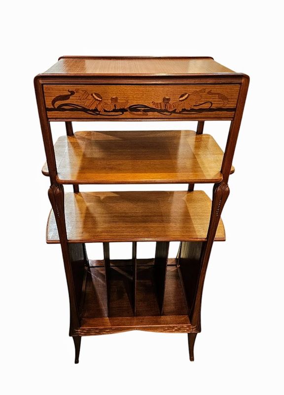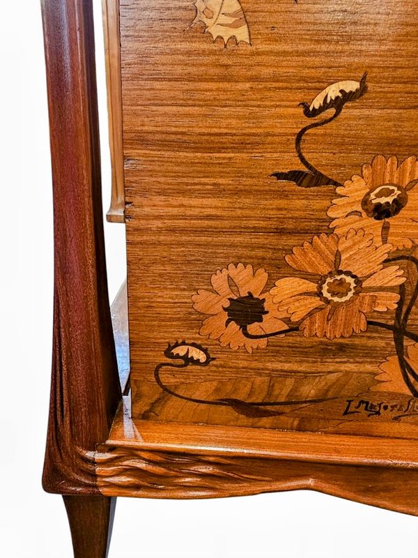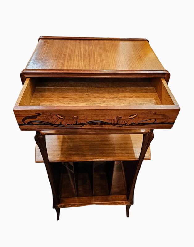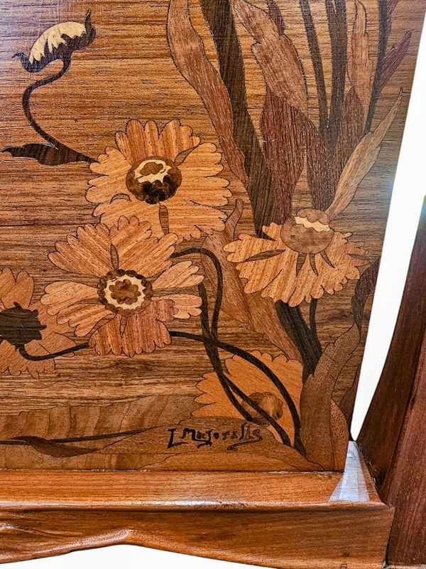 La ceinture haute et les deux panneaux latéraux présentent un décor marqueté de pavots et de papillons, elle ouvre par un tiroir en trompe l'œil, deux niches verticales et une niche compartimentée en casier à musique en partie basse.
