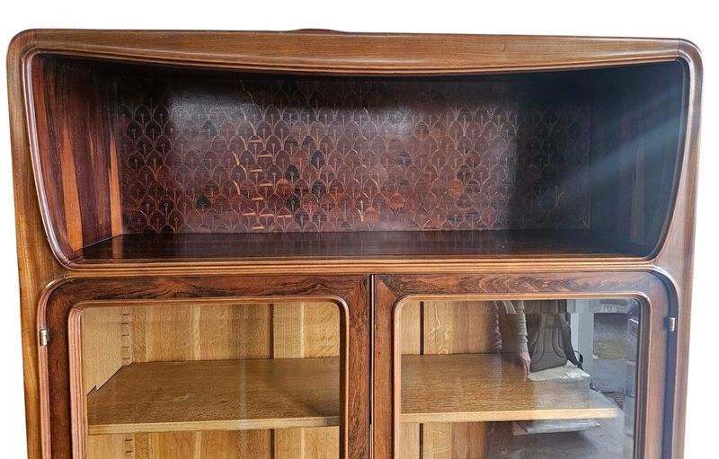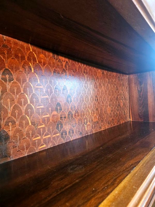 Elle ouvre par deux portes vitrées et une niche présentant un panneau marqueté de plumes de paon.